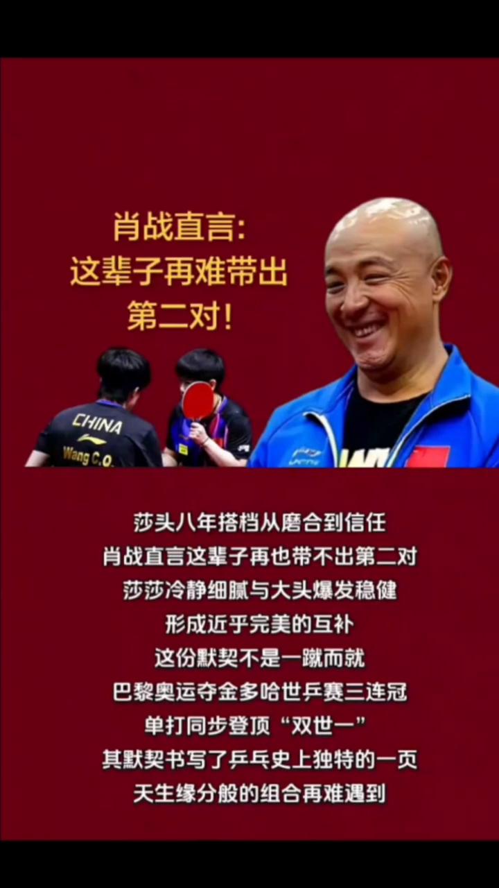 肖战直言:这辈子再难带出第二对! 莎头八年搭档从磨合到信任,肖战直言这辈子再也带不出第二对。莎莎冷静细腻与大头爆发稳健,形成近乎完美的互补。这份默契不是一蹴而就,巴黎奥运夺金多哈世兵赛三连冠,单打同步登顶"双世一",其默契书写了乒乓史上独特的一页。天生缘分般的组合再难遇到。