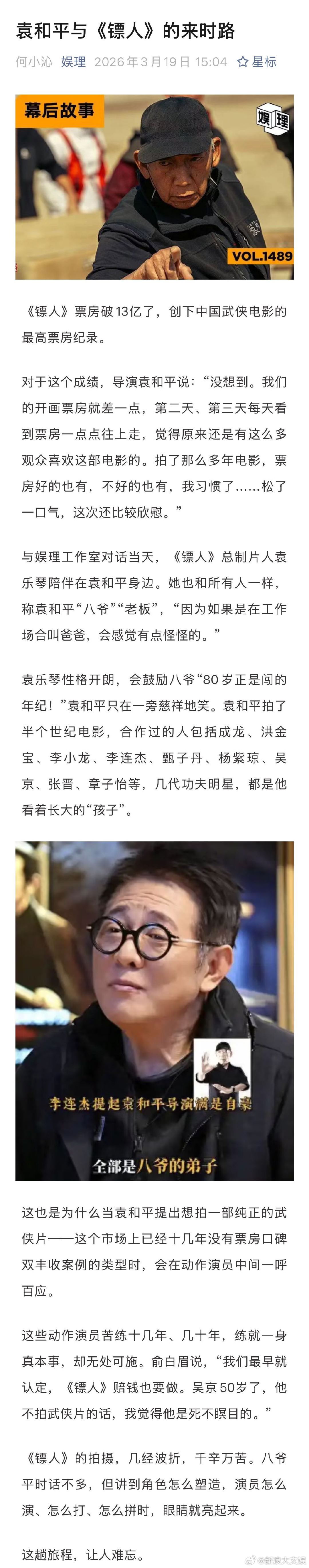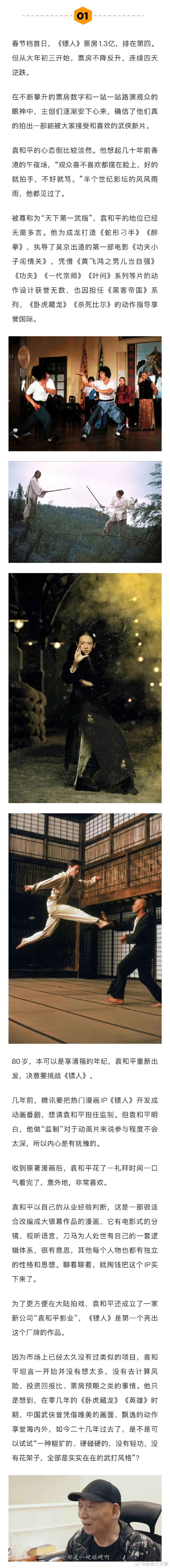 袁和平觉得陈丽君很有灵气 袁和平说镖人续集还可以拍 袁和平拍《镖人》,没有去计算风险、投资回报比、票房预期之类的事情。他只是想到《卧虎藏龙》《英雄》时期,中国武侠曾凭借唯美的画面、飘逸的动作享誉海内外,如今二十几年过去了,是不是可以试试“一种粗犷的、硬碰硬的,没有轻功,没有花架子,全部是实实在在的武打风格”娱理独家↓