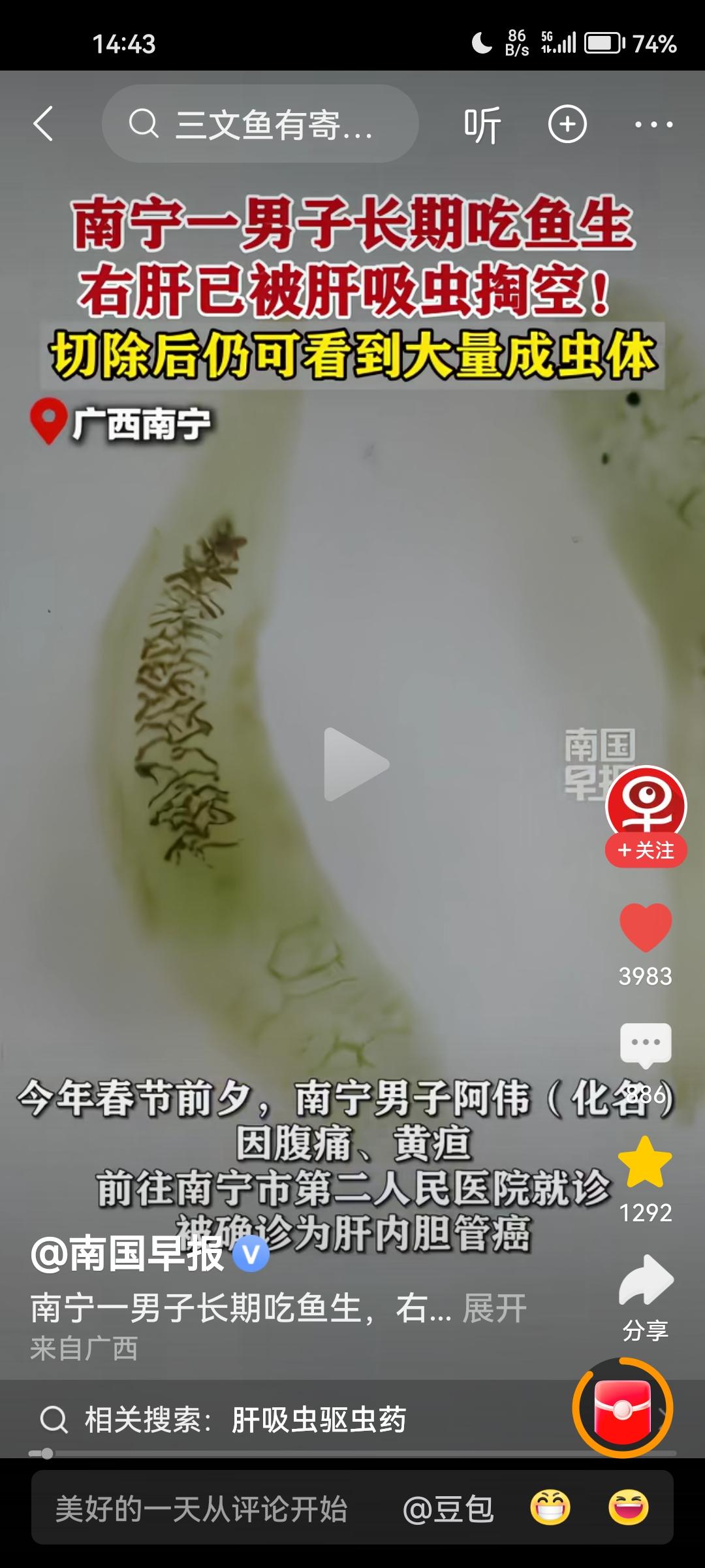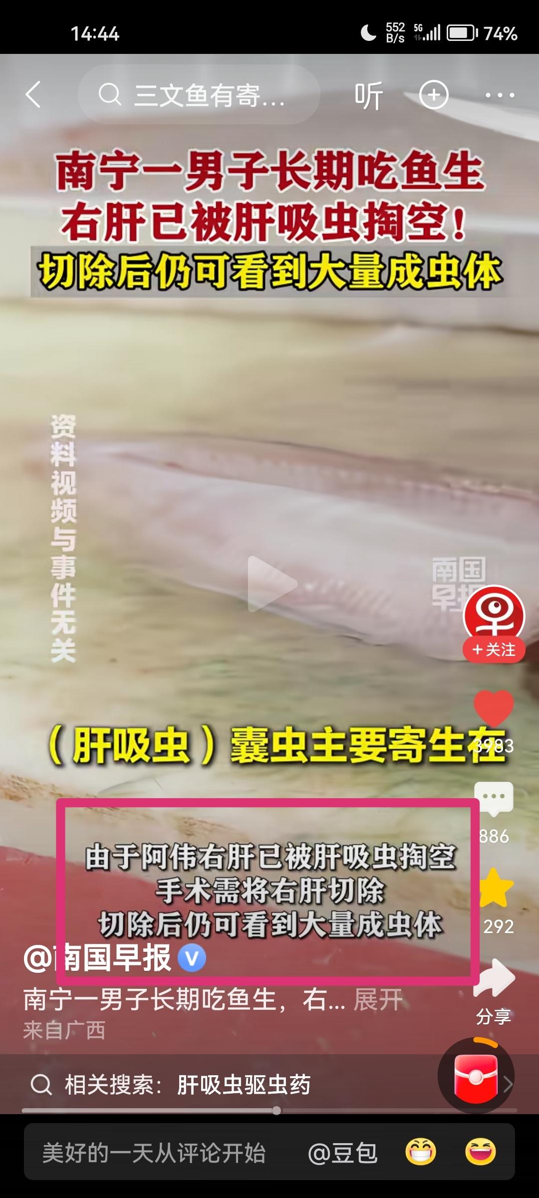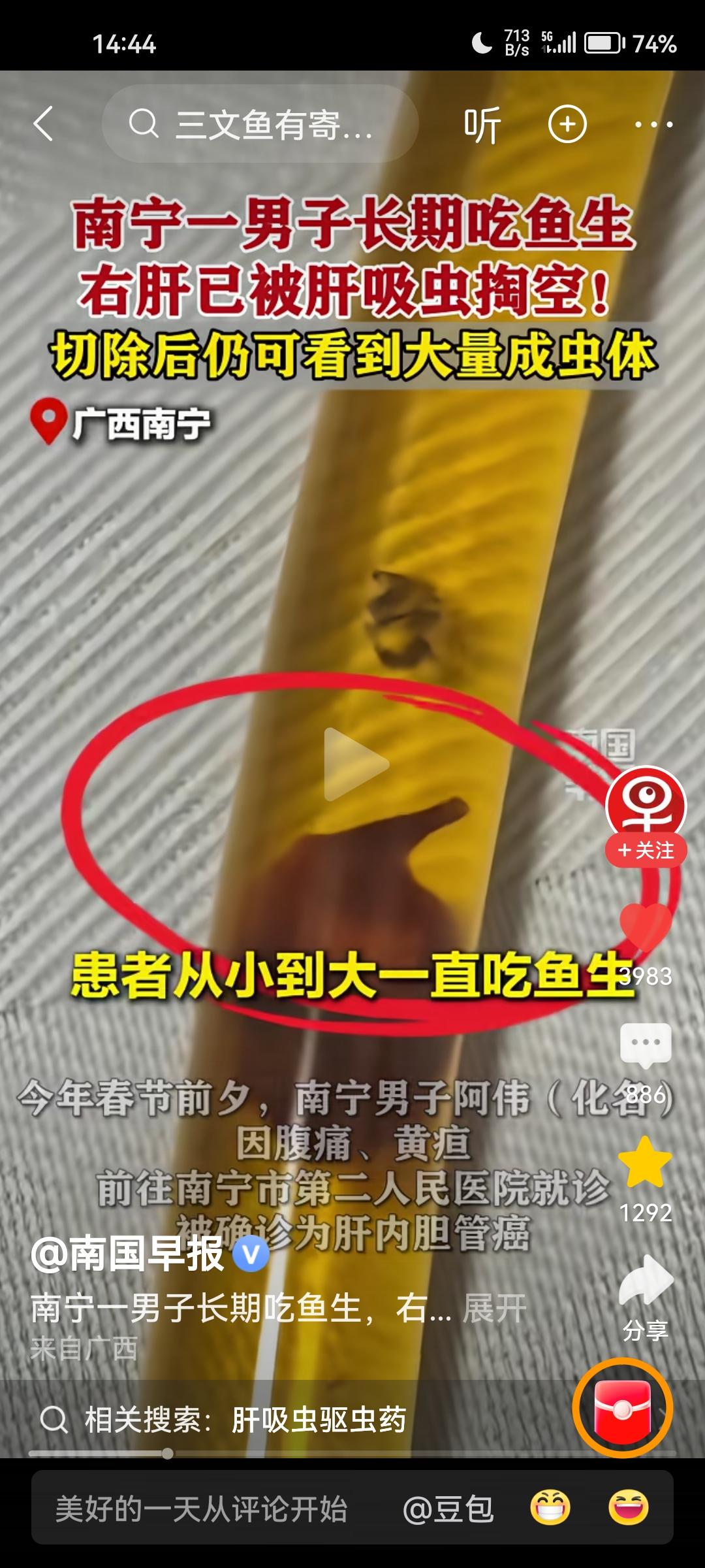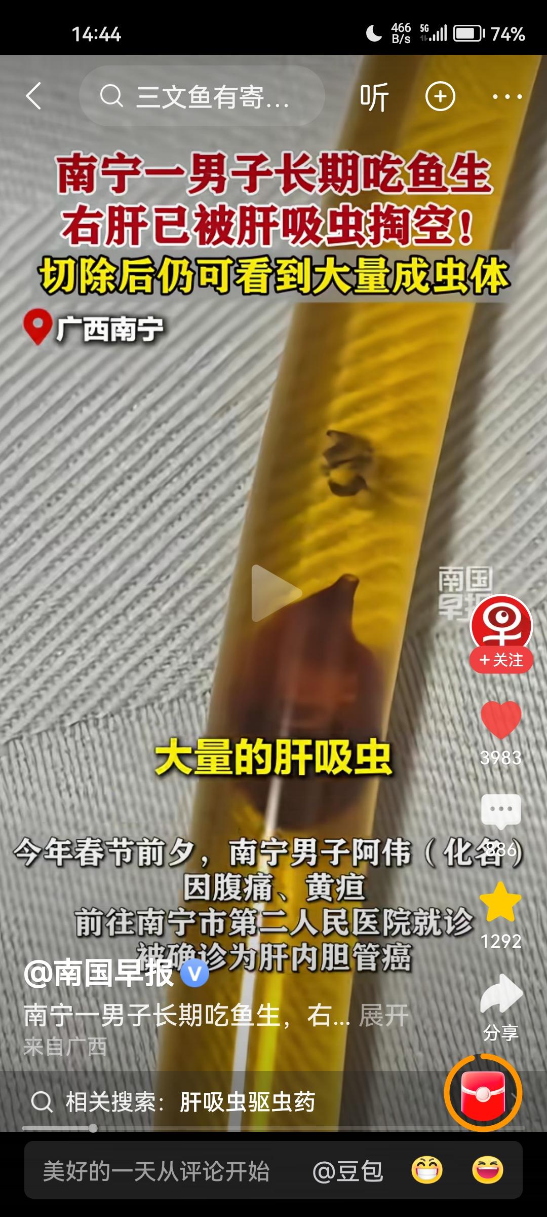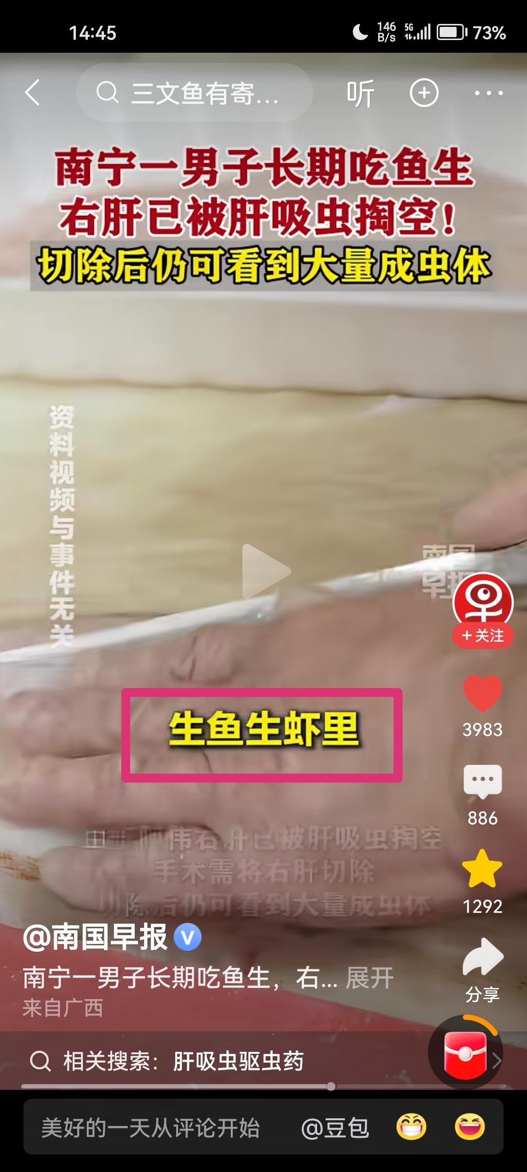 千万不要吃生鱼生虾!千万不要吃生鱼生虾!肝吸虫会掏空你的肝脏,吃掉你的肝。这绝不是危言耸听,而是广西南宁发生的真实病例(见下图)。 南方人都有吃生鱼生虾的习惯,尤其是福建和两广地区,比如福建的生腌虾,两广的鱼生等。殊不知,这种吃法具有很大的潜在风险,一旦被肝吸虫潜伏在体内,肝脏将面临巨大威胁! 我之前也偶尔吃一回生吃三文鱼这道菜,幸亏吃的次数很少,才没有感染这种可怕的肝吸虫。 为了身体健康,我决定以后不管任何场合,不管多么高级的大酒店,一律不吃生鱼生虾,包括生吃三文鱼这道菜,再想吃也要忍住。 我也是刚刚看了新闻报道,马上给友友们分享一下,希望大家以健康为重,管住自己的嘴巴。 病从口入!老祖宗的话都是朴素的生活智慧。千万不要为了口腹之欲,而忽视了健康风险。 对了,最后提醒一句,有经常吃生鱼生虾的朋友,建议你去医院检查一下肝脏,万一被感染,也可以早发现早治疗。生鱼海鲜 腌生鱼 肝吸虫危害 活体鱼生 清生鱼