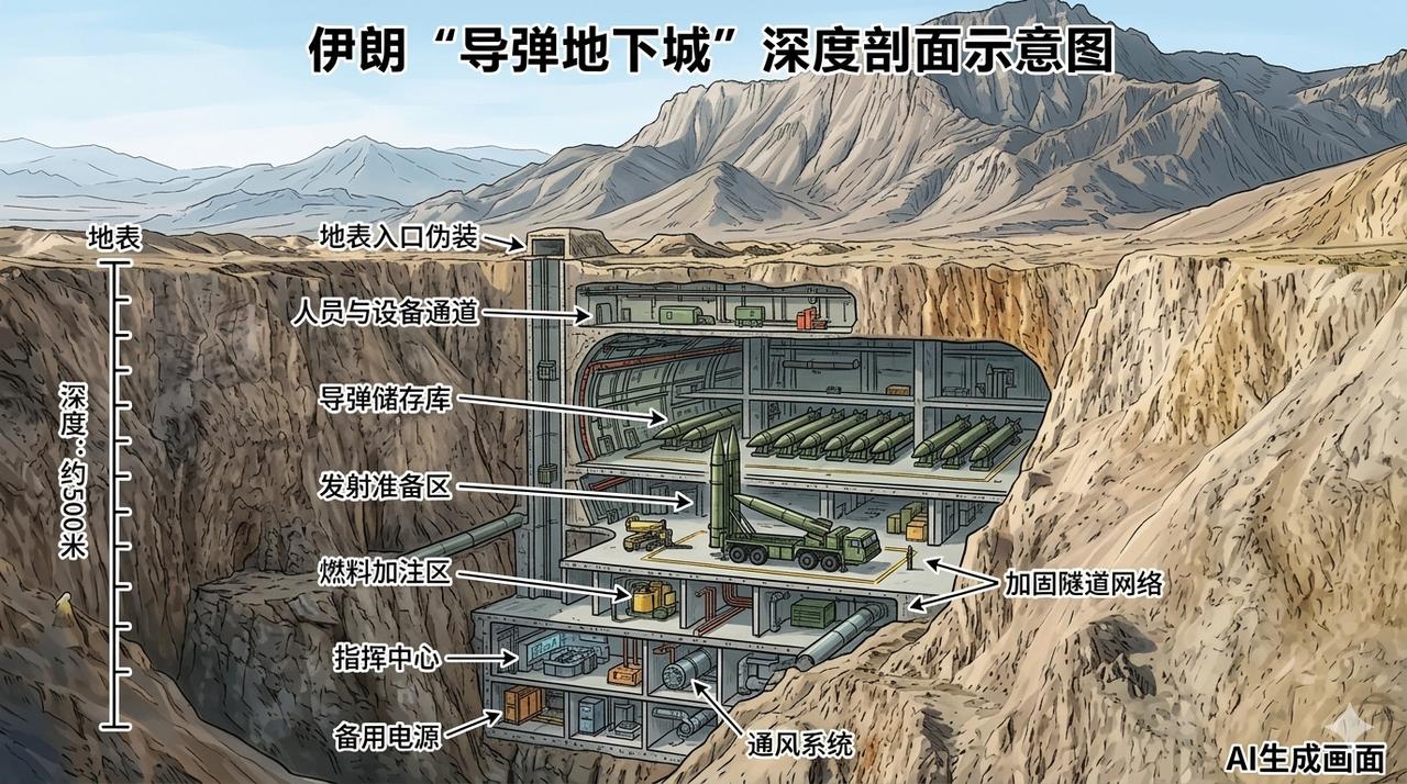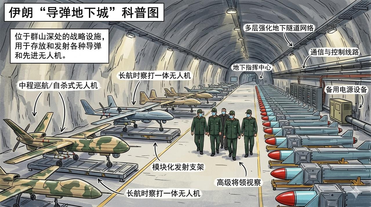 伊朗的“导弹地下城”,是伊朗伊斯兰革命卫队多年来大力发展的地下军事设施,主要用于储存、保护和准备发射弹道导弹、巡航导弹以及无人机等武器。 这些设施确实大量建在山体之下,利用伊朗西部的扎格罗斯山脉和北部的厄尔布尔士山脉等地形,提供天然的岩层保护。 伊朗从上世纪90年代起就开始大规模挖掘地下隧道网络,深度通常声称可达500米,但实际深度因地形和设施而异,许多在山体内部几十到几百米不等,利用花岗岩等坚硬岩层抵御钻地炸弹。 隧道网络宽6-10米、高6-10米左右,内部有轨道系统、转盘、储存区、组装区,甚至部分有简易地下发射井,允许导弹不需移出地面即可发射。据伊朗称几乎每个省都有,至少已公开或被情报确认的包括: 西部克尔曼沙赫地区多个山体基地。 南部霍尔木季附近基地(有9个地下发射井,面向波斯湾)。 洛雷斯坦省的霍拉姆阿巴德,被认为是最大之一。 其他如戈姆、霍拉桑、设拉子附近等。 这些设施设计目的是实现“第二打击”能力:即使遭受第一波打击,剩余导弹仍能从地下发射,对敌人构成持久威慑。 伊朗宣传这些地下城“坚不可摧”,甚至能承受核打击。但在2026年美以对伊朗的军事行动中,这些设施反而暴露了一些弱点:虽然主体深埋山下难以直接摧毁,但入口、隧道口、地面道路、发射车移动路径容易被卫星侦察和定位。 美以使用无人机24小时监视“守洞待兔”:一旦导弹发射车或设备从隧道出口现身,就立即用精确制导武器打击;B2之类的重型轰炸机投掷穿透炸弹(钻地弹)针对入口和浅层结构,导致部分隧道坍塌、武器被困地下无法出动。