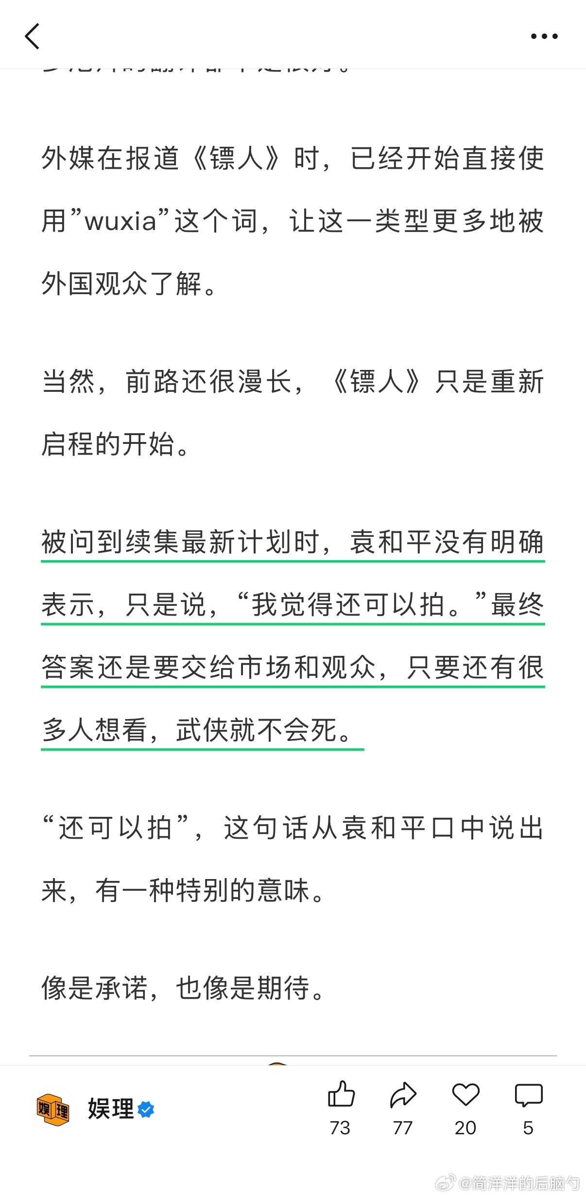 娱理工作室和《镖人》导演袁和平的对谈、很有意思,值得读一读,对谈里提到了关于续集创作的一些可能性