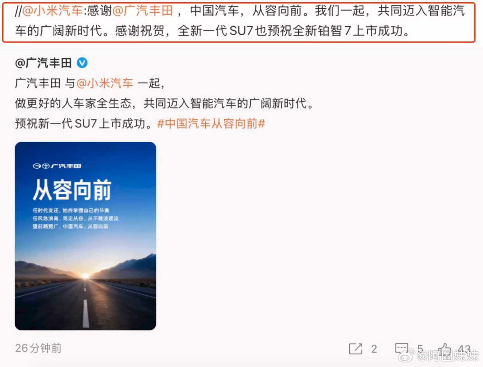 以前大家印象里对合资打法都偏保守,这次铂智7从一开始就走进了科技圈,无论是话题营造、跨界联动、还是一系列沟通节奏都能贴近当下用户的喜好。无论是从产品力、智能体验、定价策略、营销方式全方位都在像新能源时代看齐,这让让我们看到广汽丰田在电动化转型上是真的在变,步伐稳健一步步挤进新能源第一阵营。也让大家看到,合资品牌一单旦认真发力新能源,同样能快速跟上节奏。小米官微预祝铂智7上市成功