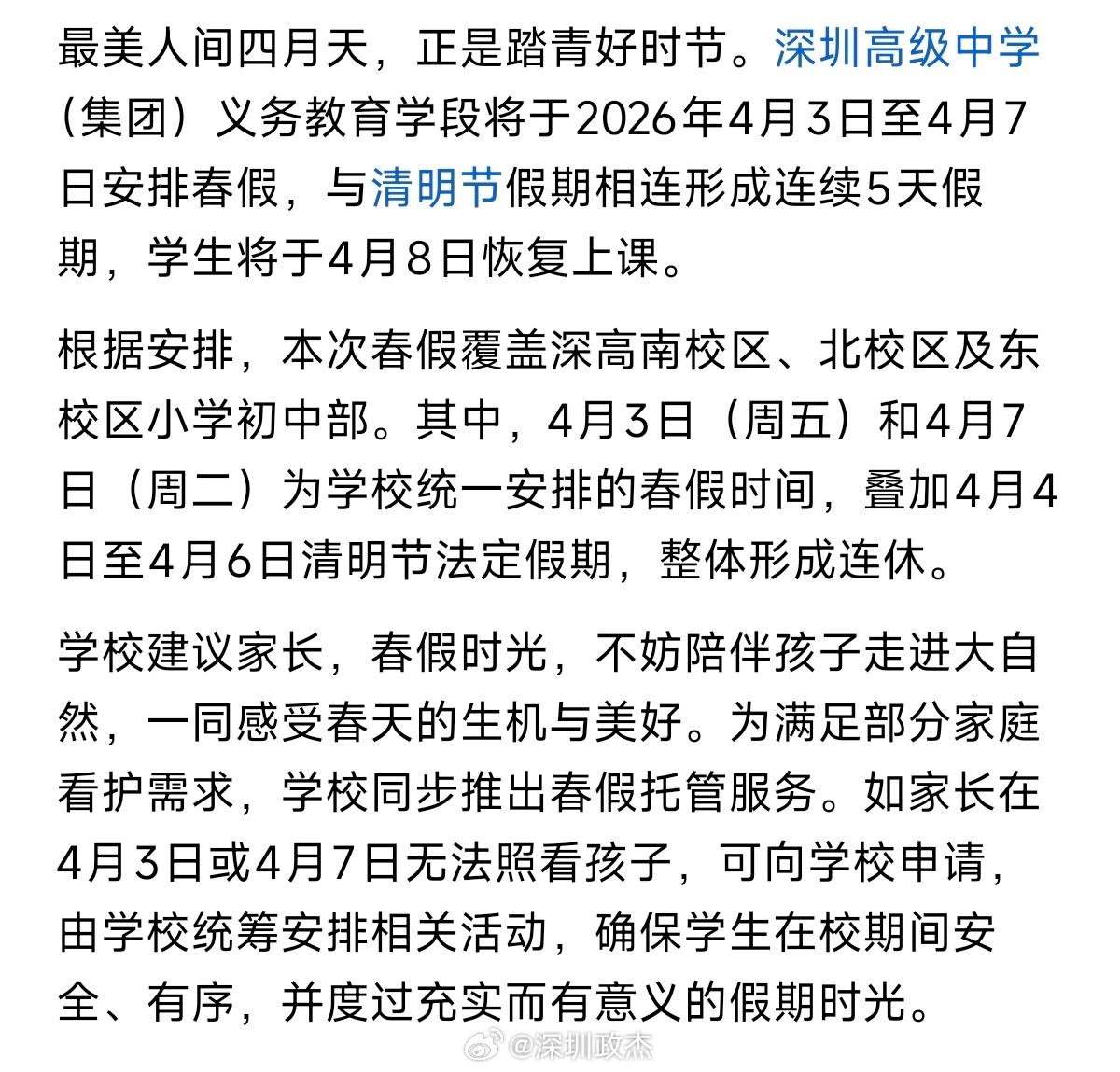 深高南校区、北校区及东校区小学初中部,安排放春假,连着清明放5天。4月3日开始,