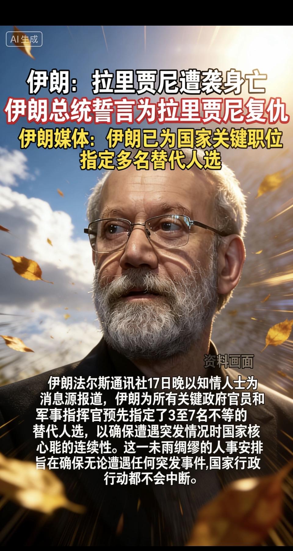 伊朗最高国家安全委员会秘书拉里贾尼遇袭身亡,伊朗总统誓言复仇;伊朗早已为关键职位预设多名替代人选,以保障国家运转的连续性。地区局势再添变数。 一次暗杀,一句复仇,一套早已备好的替代人选预案——伊朗在动荡中维持国家机器运转的布局,尽显地缘博弈的残酷与审慎。 拉里贾尼遭空袭遇难,伊朗总统放言复仇,且早已为核心职位备好替代人选,应对突发风险。