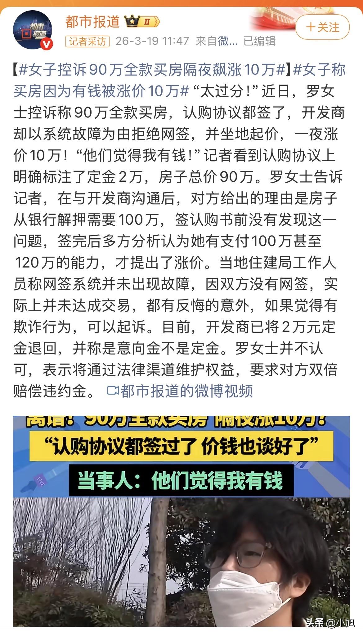 罗女士拿着手里那份认购协议,翻来覆去看了好几遍。上面写得清清楚楚,房子总价90万,定金交了2万。她怎么也想不通,这白纸黑字的东西,开发商说翻脸就翻脸。 罗女士是河南人,攒了一辈子钱,就想买套房子踏实过日子。好不容易看中一套,全款90万一次性付清,就图个省心。签协议那天她心里还挺美,觉得这事儿办得利索。售楼部的人也热情,大姐长大姐短地叫着,说第二天就能网签。 结果第二天她等了一天,没等到通知。打电话过去问,那边说系统出故障了,办不了,让她再等等。罗女士心想电脑这东西确实说不准,那就等呗。 等到第三天,售楼部来电话了,这次说话的人换了一个,口气也不一样了。对方说,大姐,这房子我们现在得卖100万,您看您能不能接受? 罗女士当时就愣住了。什么叫得卖100万?协议都签了,钱都交了,你们这是闹哪出? 她赶紧跑到售楼部要说法。开发商的人倒是不藏着掖着,直接把理由摆出来了:这房子从银行解押需要100万,签认购书之前没发现这个问题。签完之后我们内部开了一个会,分析了一下,觉得您既然能一次性拿出90万全款买房,那您肯定还有钱,有支付100万甚至120万的能力。所以这10万的差价,您这边补上,大家都省事。 罗女士听完这话,气得手都在抖。这是什么道理?因为我有钱,所以你就得涨价?那我要是有个几千万身家,这房子你是不是得卖我一个亿? 她当场就拒绝了。开发商的人也没多说什么,只是说那您考虑考虑,想好了联系我们。态度冷淡得很,跟签协议那天判若两人。 罗女士越想越气,打电话找了媒体。记者陪她一块儿去住建局问情况。住建局的工作人员查了一下,说网签系统一直运行正常,根本没出过什么故障。 罗女士听到这话,心里凉了半截。系统没坏,那就是开发商故意拖着不办。拖这一两天,就是为了找个涨价的借口。 更让她没想到的是住建局接下来的话。工作人员说,因为没有网签,这笔交易在法律上就不算最终达成。双方都有反悔的权利。如果你觉得被欺诈了,可以去法院起诉。 罗女士听完这话,脑子嗡嗡的。签了协议交了钱,就因为没点那一下鼠标,就什么都不算数了?那认购协议签了有什么用?2万定金交了个寂寞? 开发商那边倒是主动把2万块钱退回来了。但退钱的时候改了口,说这不是定金,是意向金。罗女士看着转账记录,再看看手里的认购协议,协议上那两个大字明晃晃地写着“定金”。 她没点收款。这钱她不要,她要的是开发商按协议办事。要么把房子按90万卖给她,要么按法律规定,双倍赔偿定金,给她4万。 开发商那边倒是不急,钱退回来了,你不点是你的事。反正房子现在挂100万,不愁卖不出去。 罗女士这事就这么卡在这儿了。协议签了,钱退了,房子没了。开发商那句“觉得你有钱”,像根刺一样扎在她心里。就因为能拿出90万,就活该多掏10万?这是什么逻辑? 现在罗女士已经找了律师,准备起诉。她说这事不能就这么算了,不是为了那4万块钱,是为了要一个说法。协议要是可以随便撕毁,定金要是可以随便改口叫意向金,那以后老百姓买房还能信什么? 开发商那句“多方分析”,说白了就是事后诸葛亮。签完协议发现卖便宜了,赶紧找个借口涨价。解押需要100万,这个数是怎么算出来的?早干嘛去了?签协议之前不查清楚,签完了拿这个说事,这不是欺负老实人是什么? 住建局那句“都有反悔的权利”,从法律上讲没毛病。但从情理上讲,老百姓签了协议交了钱,就以为这事儿定了。现在告诉他们这不算数,让他们去起诉。打官司耗时间耗精力,普通人耗得起吗? 最让人膈应的是那2万定金变意向金的操作。协议上写的是定金,退钱的时候就改口了。这一改,双倍赔偿就不用给了。文字游戏玩得这么溜,一看就是老手。 罗女士这事最后怎么判,得看法院。但这背后的事儿值得琢磨。如果开发商觉得卖亏了就可以随便涨价,如果签了协议都可以不算数,那这市场还有什么规矩可言?老百姓攒一辈子钱买套房,图的不就是个踏实吗?现在踏实没了,只剩下一肚子气。 大家伙儿说说,开发商这理由站得住脚吗?罗女士要求双倍赔偿,能成吗? 来源:都市报道