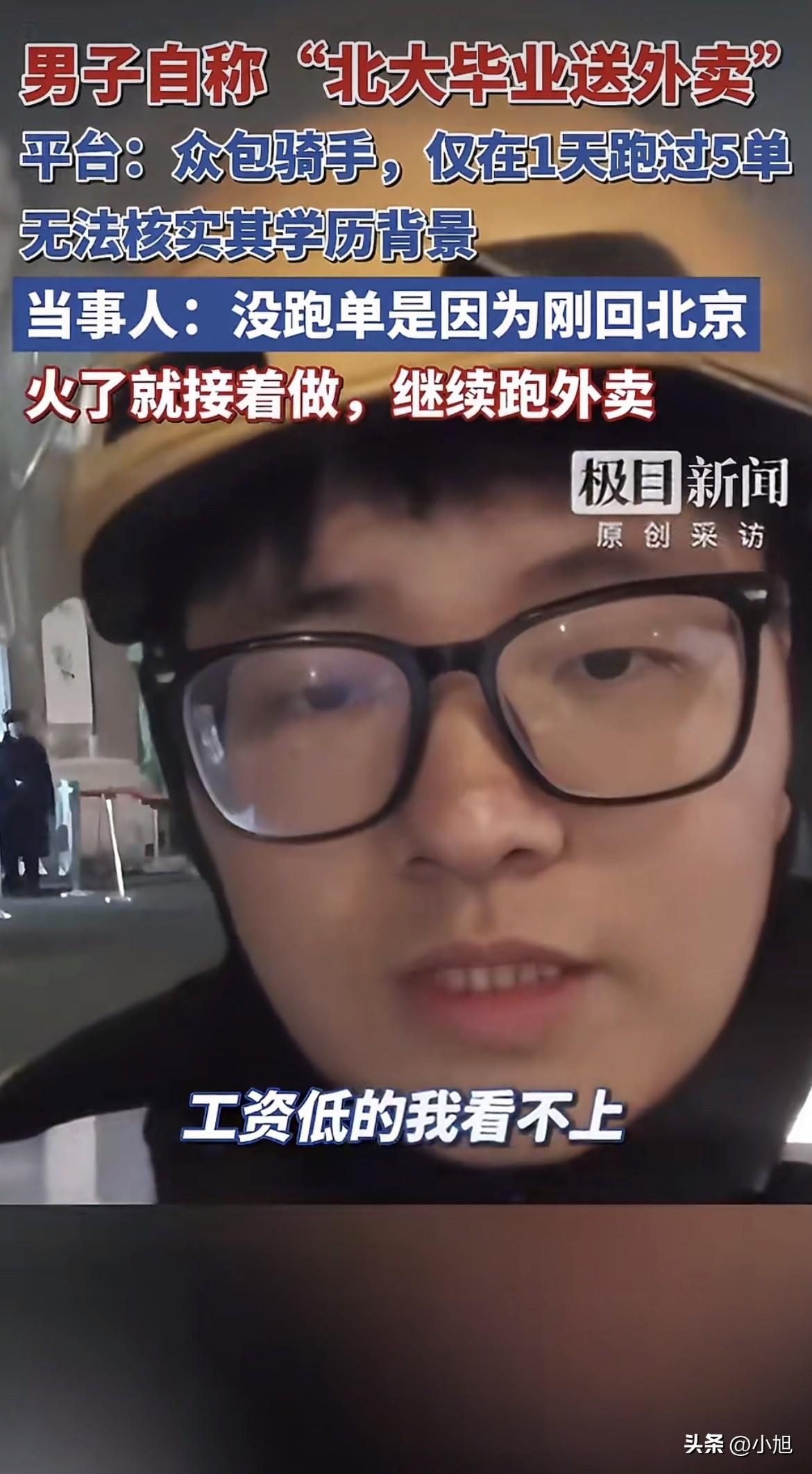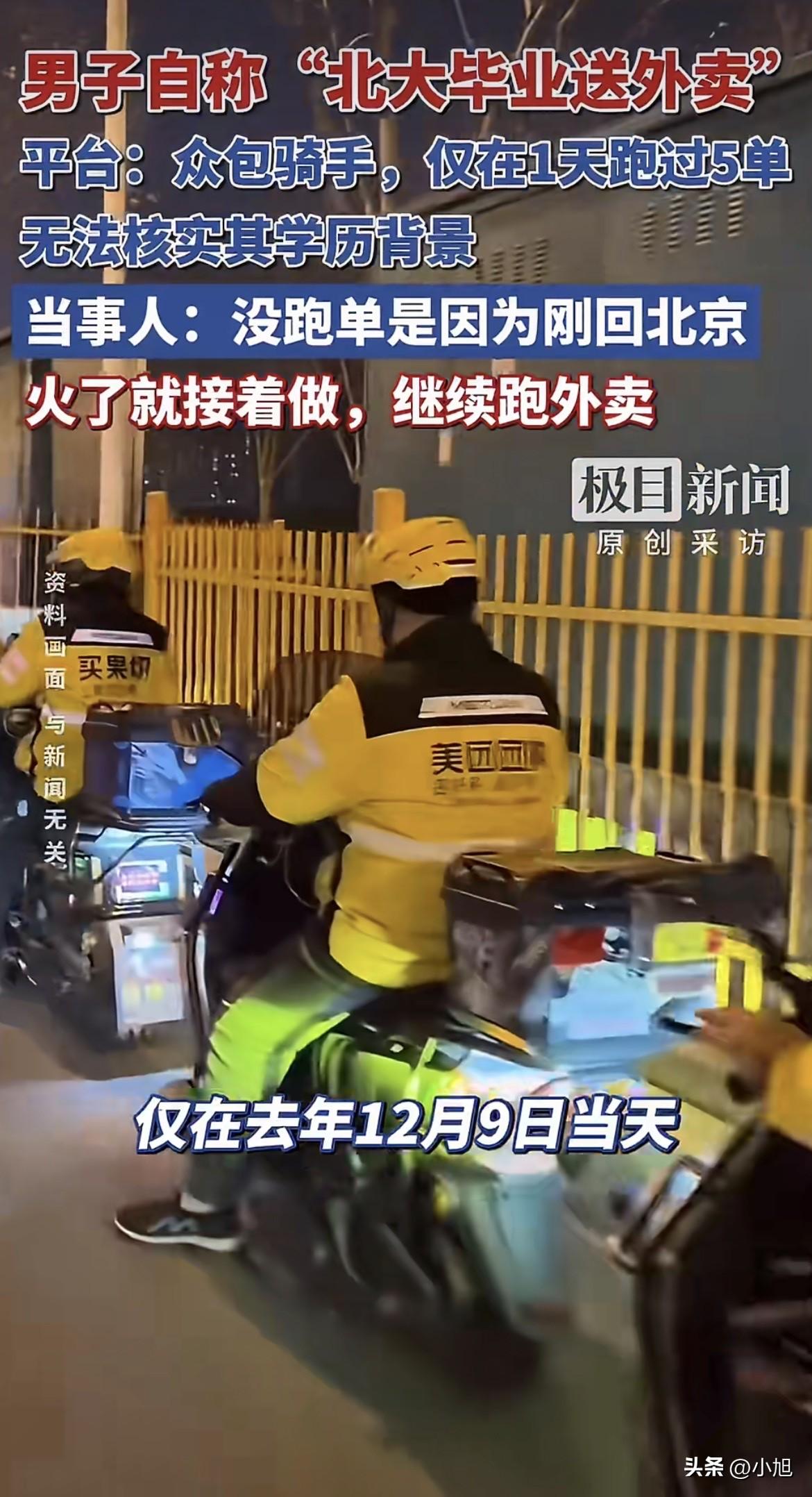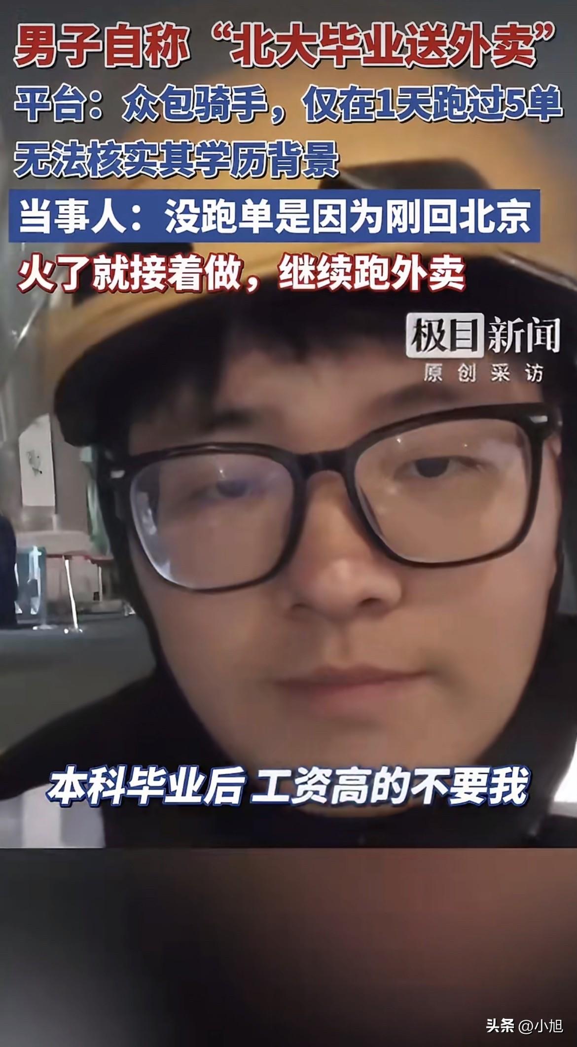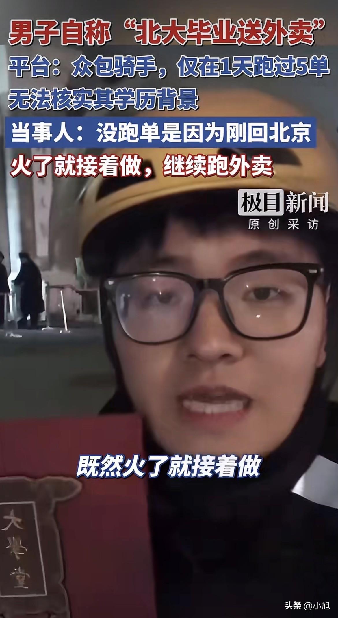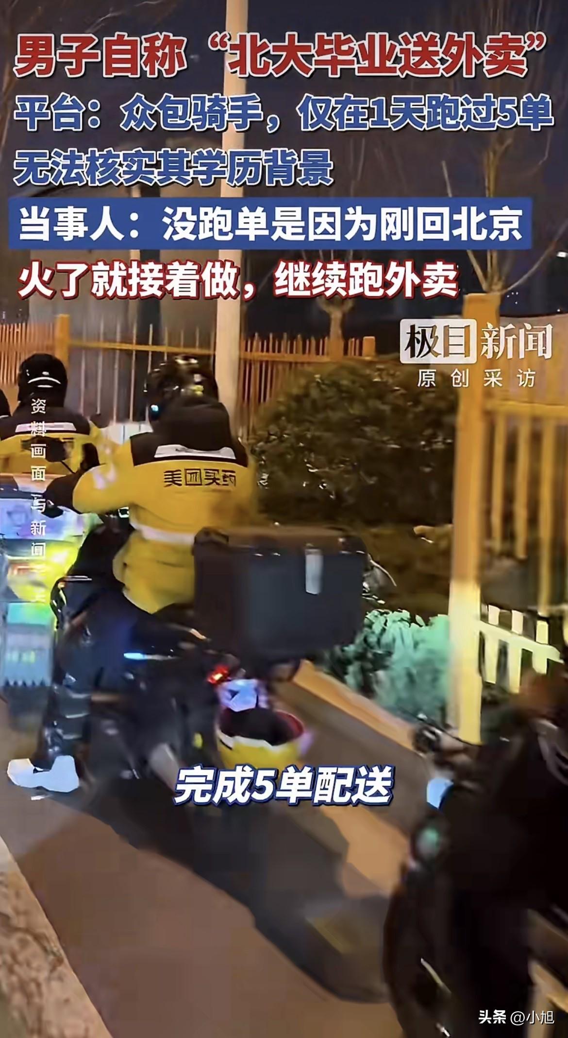 3月18号那天,一个叫“北大外卖哥陶文俊”的账号突然火了。 视频里一个年轻人穿着美团工作服,对着镜头说自己是2021年以660分考进北大的,安徽文科前100名,社会学专业。毕业以后在家躺了半年,工资低的看不上,工资高的不要他,没办法出来跑外卖。他还补了一句,社会学没教会他怎么在社会上生活。 这话说得太实在了,实在到让人心里发酸。北大毕业的都这样了,普通人怎么办?评论区全是安慰和共情,视频传得满天飞。 可第二天,美团那边就发了核查结果。 北京海淀万柳站点的站长查了系统,确实有个叫陶某俊的众包骑手,2025年12月初注册的,只在12月9号那天跑了5单,之后一次都没再接过。5单,就是体验了半天的事儿。 平台的人说,骑手注册不需要交学历证明,他们没法核实这个人是不是北大毕业的。但对那5单的记录,系统里清清楚楚。 记者去查了安徽省潜山野寨中学2021年的高考录取榜,302班陶文俊,名字确实在上面,被北京大学录取。他的学历是真的。 可那个“走投无路才送外卖”的故事,被后台那5单记录戳破了。 记者再打电话问他,为什么美团说去年12月以后就没跑过单?他回了一句“我刚回北京”,然后匆匆挂了电话。 原来的那条视频很快删了。 后来他又发了一条新的,解释说火的视频不是当天拍的,是两三个月前随手送了一次外卖,把当时的感想记了下来,最近看别人火了才跟着发的,没想到真火了。他还强调,送外卖不是博流量,也不是完全找不到工作,是“自我救赎”。以后还要继续在中关村跑外卖,开直播跟大家聊聊送外卖怎么治愈了他。 去年7月也有过“清华毕业跑外卖”的事,美团核查发现那个人4个多月只送了34单,跟他自己说的“成千上万单”差得太远。平台回应后,那人也把穿外卖服的视频删了。 同样的套路,换了个名字,又来了一遍。 陶文俊的朋友圈从去年开始一直在做教培,帮人对接老师、学生,分享学习方法。去年年底还发过一条,说起的新号十几天出了五六个万赞爆款,涨了小两千粉。他懂流量,也懂怎么起号。 这次“北大外卖哥”的人设,从选题到话术,每一步都踩在流量点上。北大和外卖,两个标签碰撞在一起,加上学历贬值、就业焦虑这些当下最敏感的话题,效果比他之前那些教培内容好太多了。 只是这个故事里,那个“实在没办法了”的年轻人,跟那个“只在12月9号跑了5单”的人,不是同一个。 他在视频里说自己眼高手低、在家躺了半年,那些话听起来像在反思,其实是在演戏。他把自己塑造成一个走投无路的人,让所有正在为工作发愁的人在他身上看到自己的影子。那些安慰、那些共鸣、那些转发,都是冲着这个影子去的。 可他自己呢? 他站在摄像头后面,看着评论区里那些真心替他着急的人,心里盘算的是下一场直播什么时候开。 3月19号,他说要开直播了,聊聊送外卖怎么治愈了他。 送外卖可能真的治愈了他——治好了他流量焦虑,治好了他账号没热度的毛病。但那些被他这个故事戳中的人呢?那些因为他的视频又开始担心“北大毕业都这样了,我怎么办”的人呢? 互联网上,一个标签能成就一个人,也能让人忘了追问。北大的光环是真的,5单的记录也是真的。他把这两样放在一起,讲了一个大家愿意听的故事。 这个故事里,他卖的不是外卖,是焦虑。赚的不是配送费,是流量。 有人说,就算是假的,至少让大家关注到了就业难,有啥不行? 可问题是,真正难的人还在街上跑单,一单一单挣辛苦钱。他在镜头前穿一次工服,说几句“眼高手低”,就把所有人的注意力都吸走了。那些真正靠送外卖养家糊口的人,那些学历不高、每天跑几十单的人,反倒没人看了。 你可以假装生活,但生活不会陪你演戏。 (本文综合自极目新闻、每日经济新闻、中国青年网、大象新闻等媒体报道)
