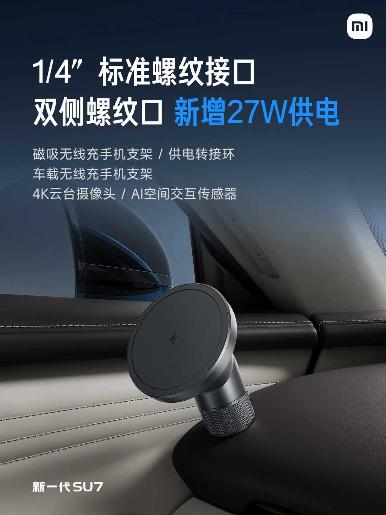 新一代SU7 全车9处磁吸点位,同样适配磁吸物理按键,一键即可控车。主副驾的1/4″标准螺纹接口 新增27W供电,可拓展连接4K云台摄像头,AI空间交互传感器等等
