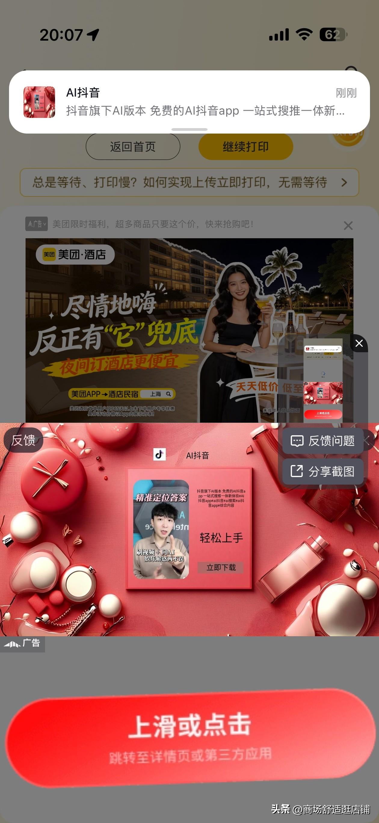 这是我见过的,广告最多的 app,应该没有之一了吧? 点进去就一个广告,你手机还没动,立马跳出摇一摇广告你还没反应过来立马跳到广告内容第三方 app 去了,然后你返回开始打印东西,打印完,直接给你满屏显示 4-5 个广告!真的是无敌啊,服了! 这个什么-小白打印,你真的那么缺广告钱吗?这还是 iOS 系统,不是说 iOS 系统所有app 都监管的么?这不妥妥流氓软件木马么?要不是为了在线 WiFi 打印(找不到更好 app),谁用你这玩意手机端广告 ,简直无法无天了!