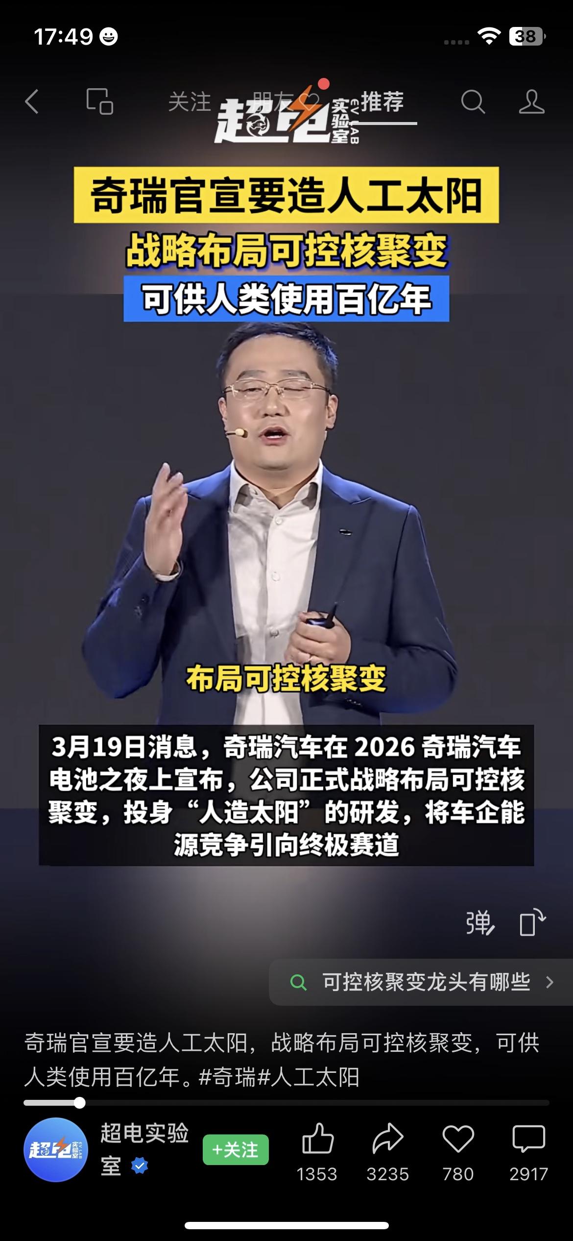 牛!奇瑞官宣造“人造太阳”,能源能用百亿年,中国科技要逆天了! 太提气了!奇瑞突