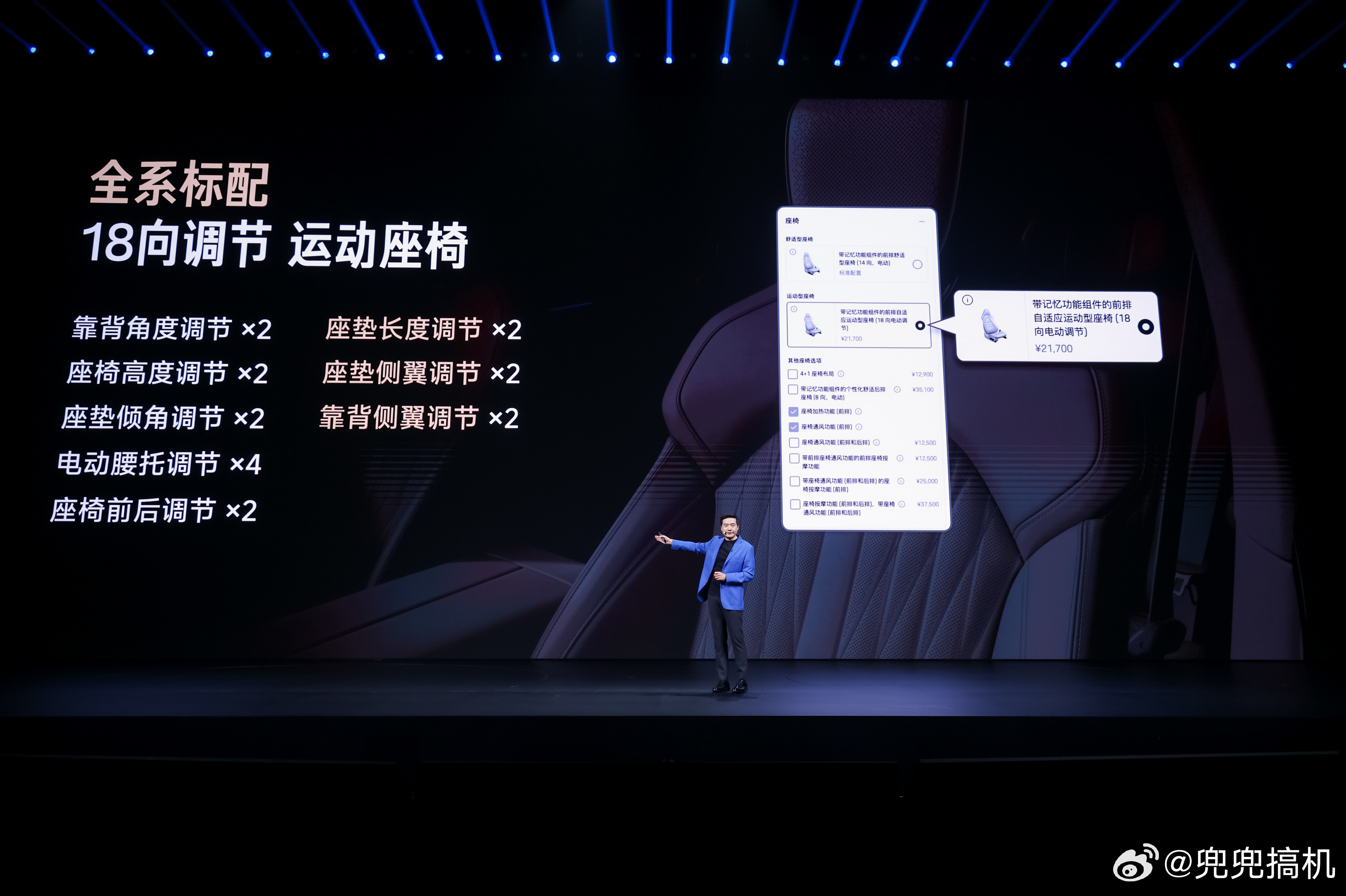 座舱方面:全系标配18向调节运动座椅,标配主动侧翼支撑,后排座椅高频接触面填充增加20mm,座垫侧翼延长25mm,躺倒角度提升至121°,升级舒适睡眠头枕。