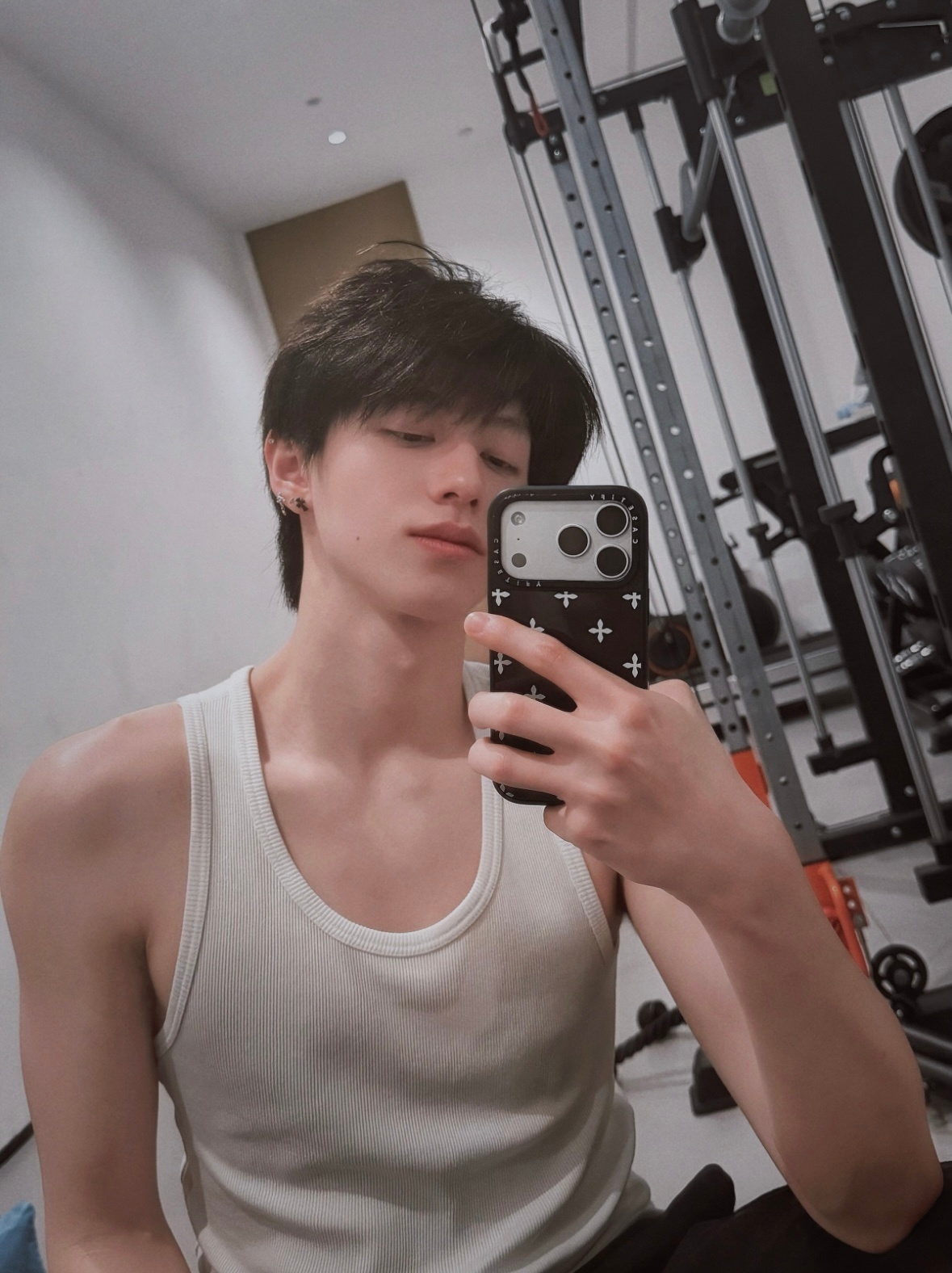 朱志鑫健身房对镜拍朱志鑫高会更新健身房对镜拍!白背心勾勒出利落肩线与流畅肌肉线条,帅的太超过了🥵朱志鑫白背心肌肉线条