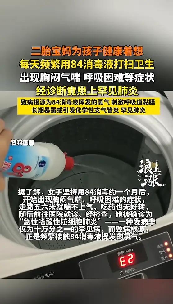 “太吓人了!”江苏淮安,一女子为了宝宝健康,每天用84消毒液打扫卫生,坚持了约一个月后,女子开始胸闷气短,并且走五六米就喘不上气,去医院检查,竟被急性嗜酸性粒细胞肺炎,这病的发病率仅为十万分之一!网友:心真大! 女子三十五岁,家里刚添了二胎,有了小宝宝,她把家里每个角落都擦得锃亮,从拖地到擦桌子,从卫生间到厨房,她每天用84消毒液里里外外清洁一遍。她觉得,这样孩子才能在一个绝对干净的环境里长大。 大概过了一个月,她感觉胸口像压了块大石头,闷得慌。喘气开始费劲,走上几步路,就得上气不接下气地停下来歇着。她以为是自己累着了,没太当回事。可症状一天比一天重,普通感冒药根本不管用。 她赶紧去了淮安市第二人民医院。呼吸科的医生一听她的情况,再问到她天天用84消毒液的习惯,心里大概有了数。检查结果是急性嗜酸性粒细胞肺炎。这种病极其罕见,发病率只有十万分之一。 医生说问题就出在那瓶84消毒液上,它的主要成分是次氯酸钠,这东西挥发出来的氯气,吸进肺里会和呼吸道黏膜里的水分发生反应,生成次氯酸和盐酸,直接刺激和损伤肺部组织。时间一长,好好的肺就可能发炎、受损,甚至引发这种罕见的肺炎。 张女士经过对症治疗,情况已经好转。但这场病给她,也给所有家长敲响了警钟,家里真没必要搞成“无菌实验室”。过度消毒,有时候比不消毒还可怕。我们总想给孩子最好的保护,却忘了人体本身就需要接触一些微生物来建立正常的免疫系统。一个在“无菌”环境里长大的孩子,抵抗力可能反而更弱。 开窗通风,其实是最好、最安全的空气净化方法。如果确实要用84消毒液,一定记得按说明书比例稀释,戴上口罩和手套,弄完赶紧开窗,别在密闭空间里待太久。千万别图省事直接倒原液,更绝对不能和洁厕灵这类东西混用,那会产生剧毒的氯气。 爱孩子的心可以理解,但方法要用对。别让母爱因为缺乏常识,变成了伤害自己和家人的利刃。干净不等于无菌,安全比绝对干净更重要。 各位读者你们怎么看?欢迎在评论区讨论。