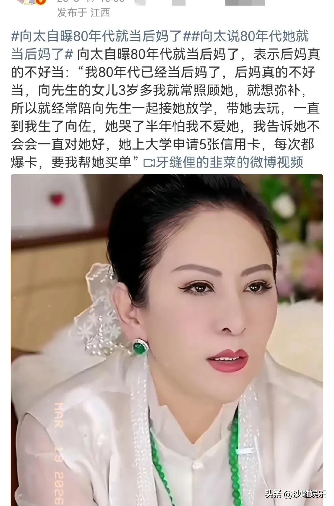 向太,太让人意外了! 3月19日,向太又冲上了热搜,这次不是因为手撕谁,也不是因为炫富,而是在直播里罕见地聊起了自己的“后妈血泪史” 。 向太自曝,早在1980年她嫁给向华强时,年仅23岁就直接“喜当妈”,接手照顾向华强与前妻丁佩的女儿向咏恒(当时仅3岁) 。 那时候的她可不是什么豪门阔太,而是个小心翼翼的“补救员”。为了弥补孩子父母离异的缺失,她天天陪着接放学、带出去疯玩,生怕孩子觉得这个后妈不好 。 本以为真心能换真心,结果等她自己生了向佐,难题来了。小姑娘看着弟弟,整整哭了半年!就怕有了亲儿子,后妈就不爱自己了 。向太也是心酸又好笑,只能搂着孩子保证:“不会的,我会一直对你好。” 这后妈当得,不仅要哄小的,还得照顾大的情绪。 更绝的是,向太透露这姑娘上大学时申请了5张信用卡,次次爆卡,最后谁买单?还是这位“向妈妈” 。 其实,向太对这个继女的包容,远不止还卡债。当年她主动把给前妻丁佩的抚养费从5000块提到10万,还霸气放话:“我会养她们一辈子!” 。这份气度,直接让现任和前妻处成了亲人,这种“豪门格局”确实不是谁都能有的 。 以前总觉得向太是那个在娱乐圈翻手为云覆手为雨的“女大佬”,没想到脱下盔甲,她也不过是个会被孩子气得没脾气、一边抱怨一边掏钱的普通妈妈 。 不管是豪门还是普通人家, “后妈”这两个字,写出来容易,做起来全是鸡毛蒜皮和如履薄冰。 向太用40年证明了,真正的豪门底气,不是有多少爱马仕,而是能把一个因为害怕失去爱而哭了半年的孩子,最终变成一辈子离不开你的家人 。这份“温柔”,才是她最贵的一件高定。