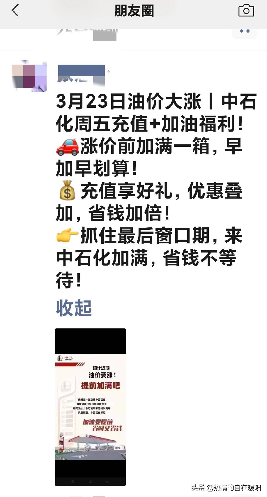 见朋友圈说 油价又要涨了 赶忙提醒孩子们 油价上涨 与每个人都息息相关 战争是油价波动的强导火索 影响石油供应 推高风险溢价 出行成本随之上升 油价号称“万价之基” 一旦上涨 物流、化工、交通等行业成本增加 生活开支也会水涨船高 对普通人而言 油价涨跌是生活“涨与省”的小事 一张加油海报 也能窥见国际局势变化 趁有优惠 及时加满油 这是最实在的选择 真的是: 油价又要往上涨 战争牵动油供应 万价之基它领头 生活成本跟着动 趁有优惠赶紧加 平安省钱最实用