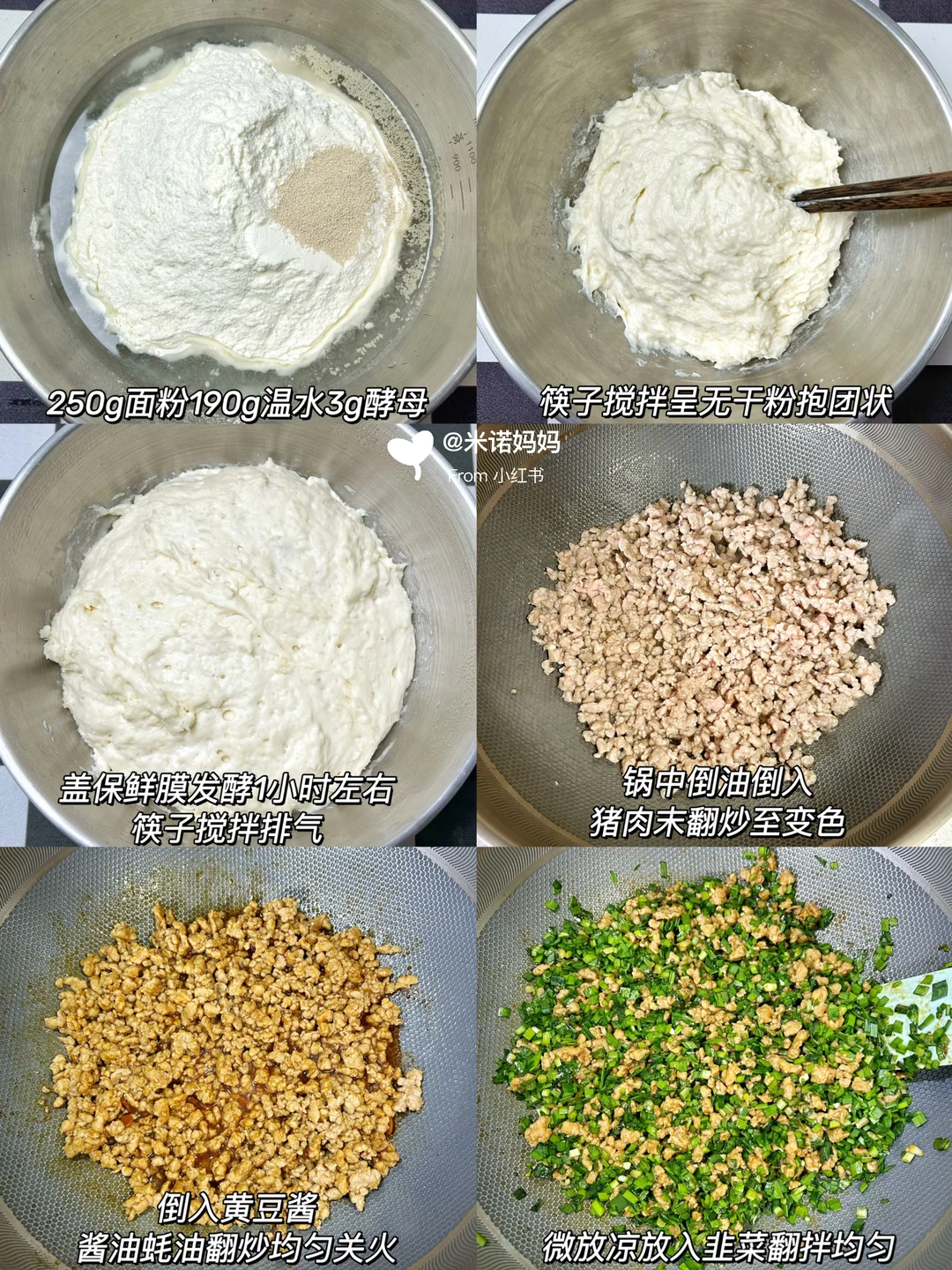 面粉250g | 温水190g | 酵母3g | 猪肉末250g | 韭菜适量