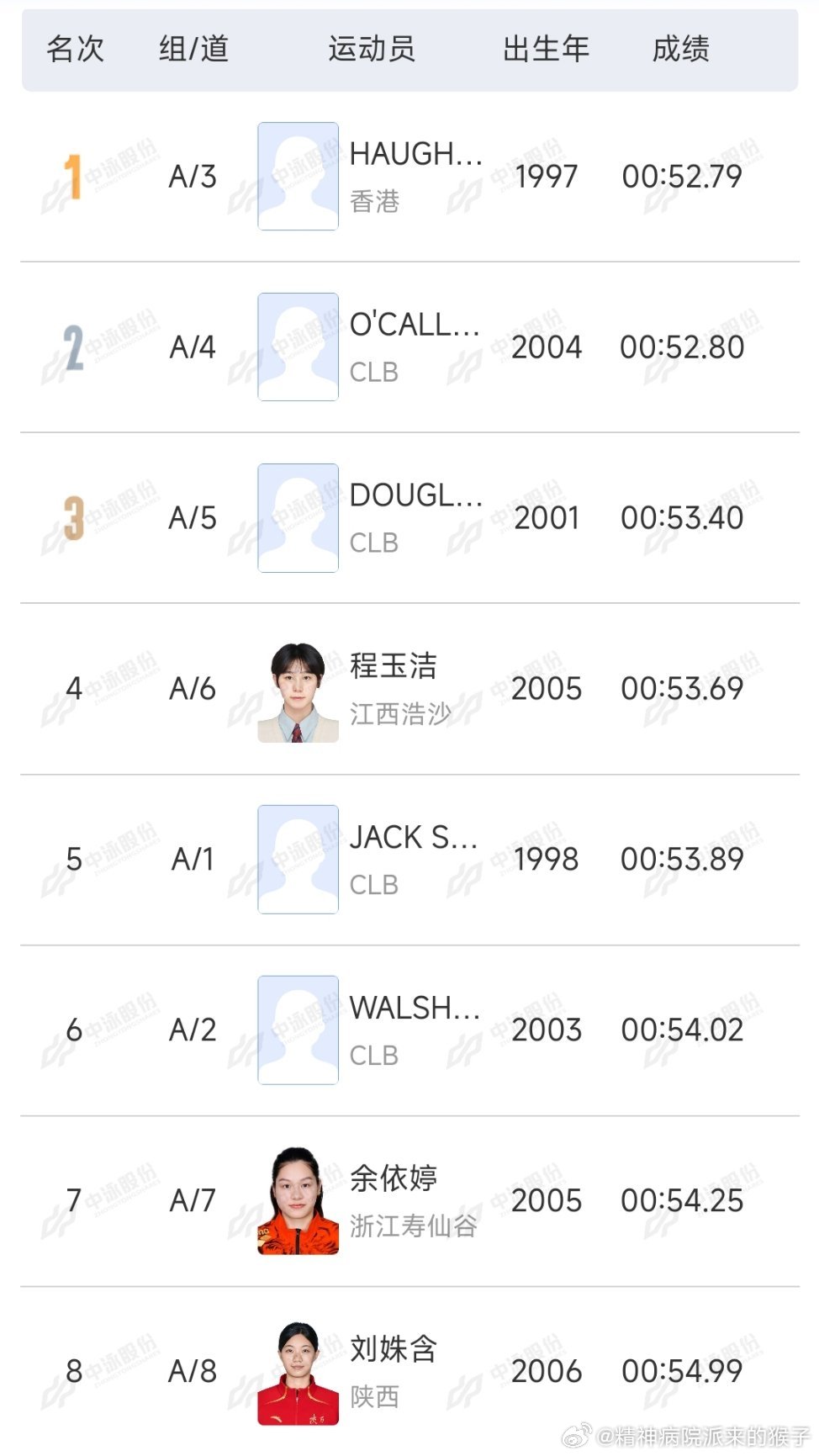 2026年中国游泳公开赛 女子100米自由泳决赛:何诗蓓52.79获得冠军🏆险胜0.01奥卡拉汉52.80获得亚军🥈道格拉斯53.40获得季军🥉程玉洁53.69获得第四名余依婷54.25获得第七名刘姝含54.99获得第八名