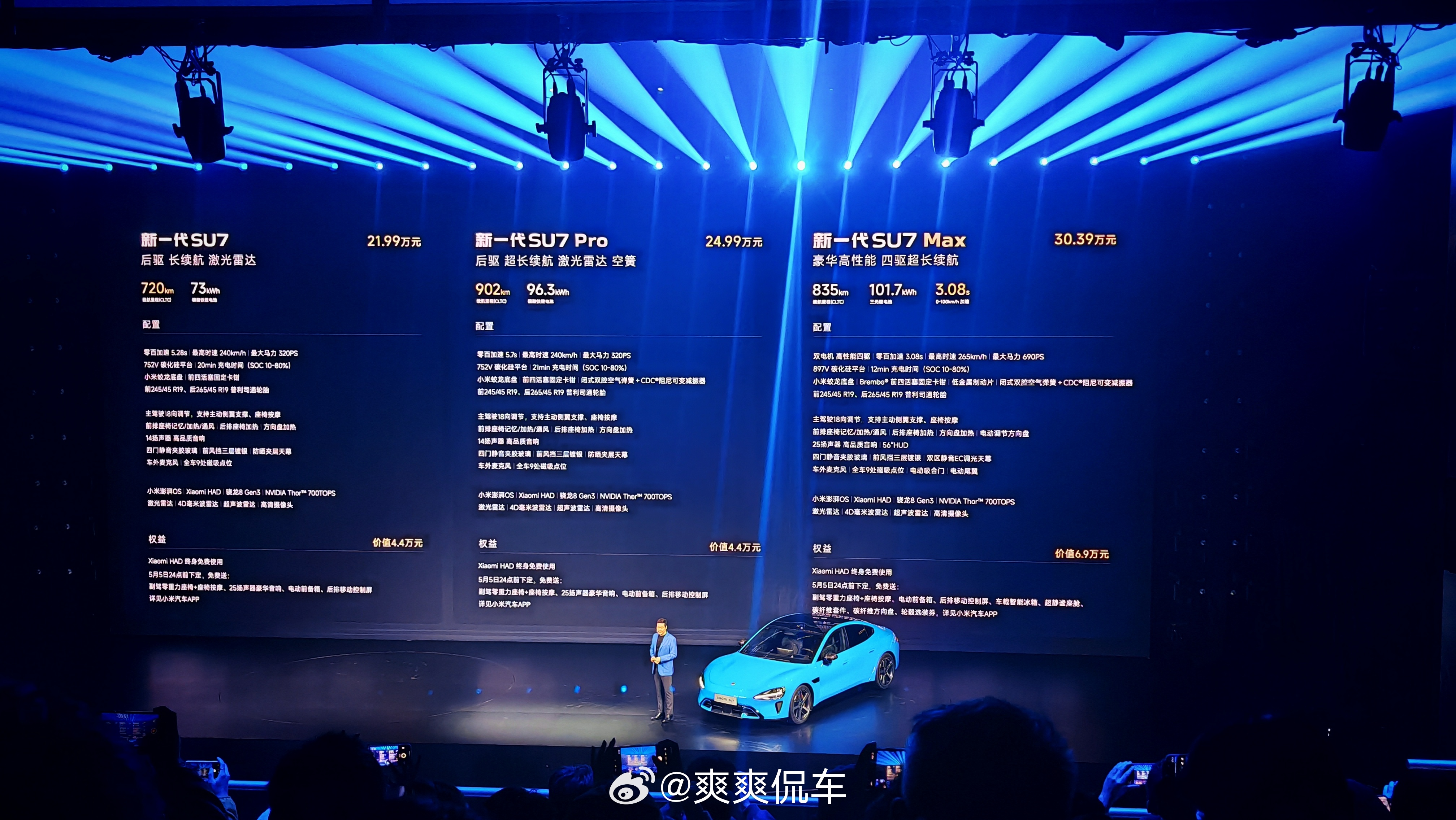 行了。。车圈价格战又要开始了!!!新su721.99Pro版24.99Max30.39不光价格惊人。。还送一堆选装。。更厉害的是锁单了还能改选配(不能改版本)!!同样准现车1-5周交付!!新su7的试驾视频明天发!大家可以看看再决定买哪个哈哈哈。。小米新SU7价格