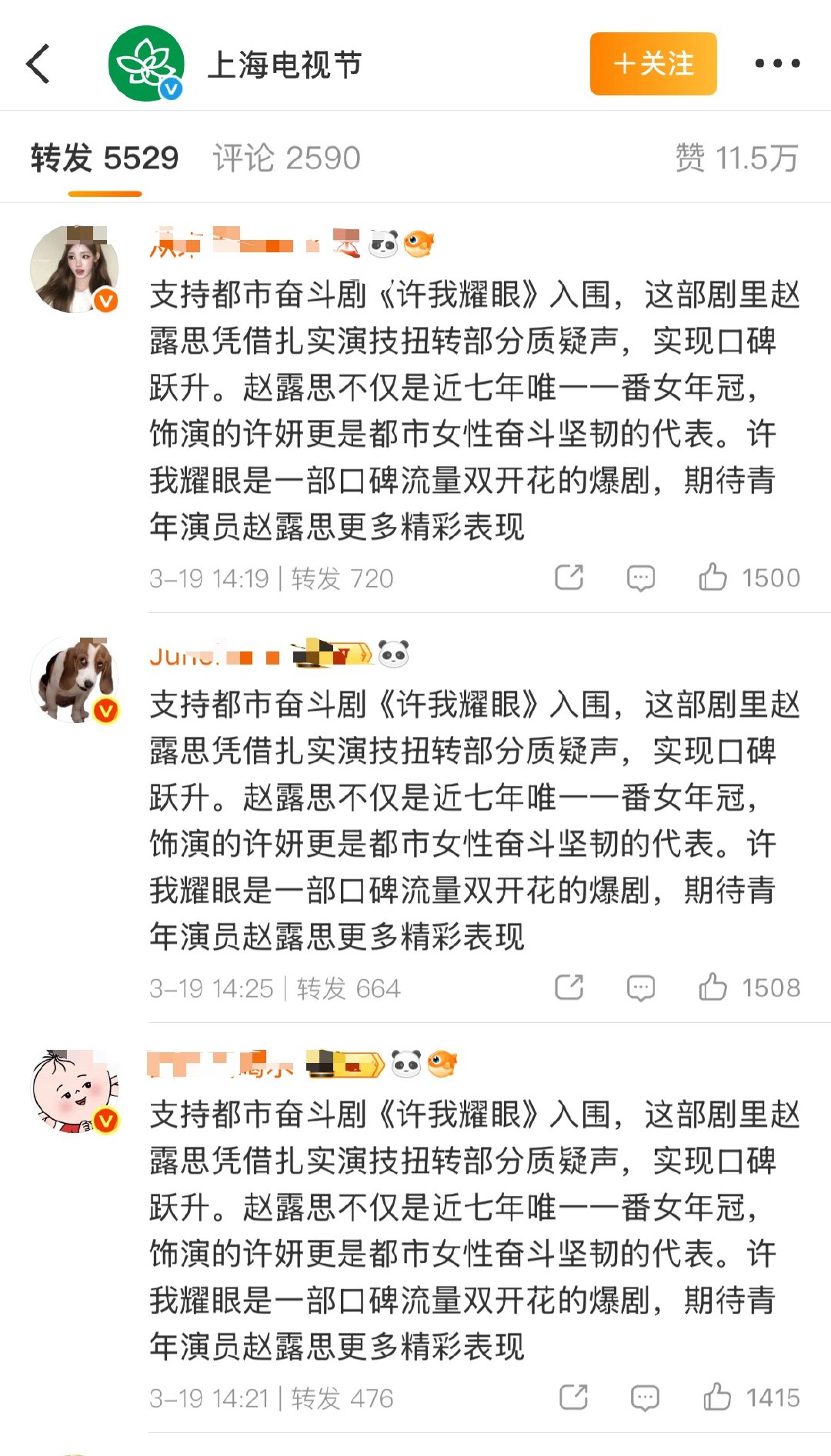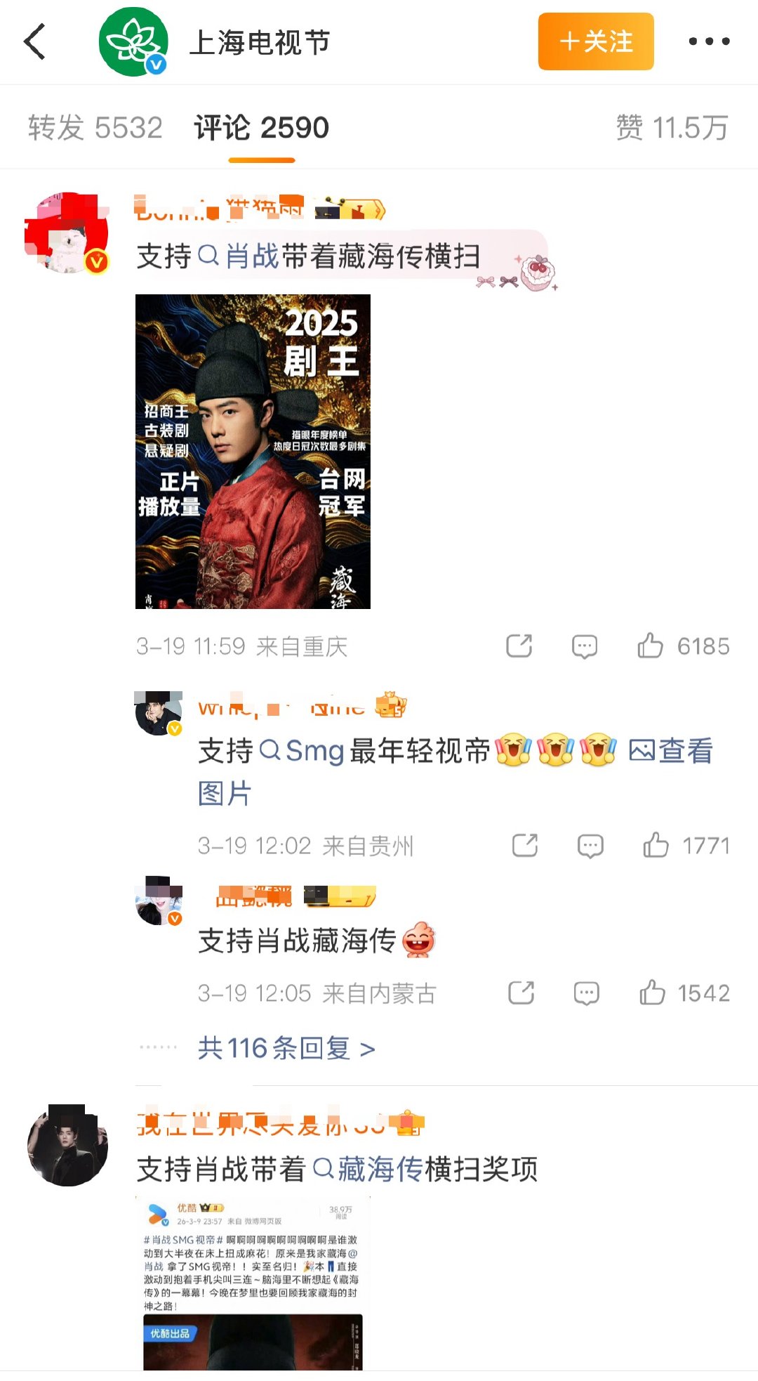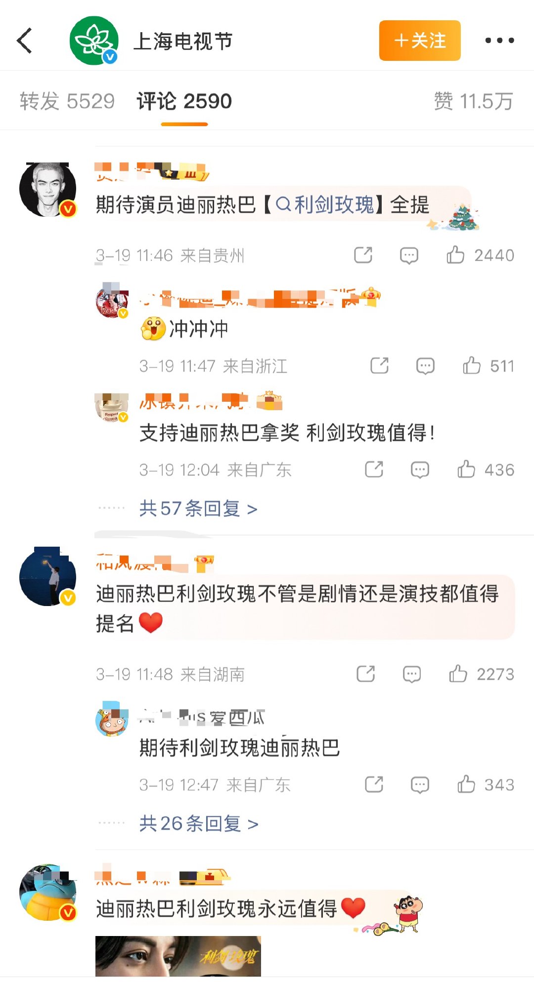 白玉兰微博前排主要是迪丽热巴 杨紫 赵露思 肖战粉丝。