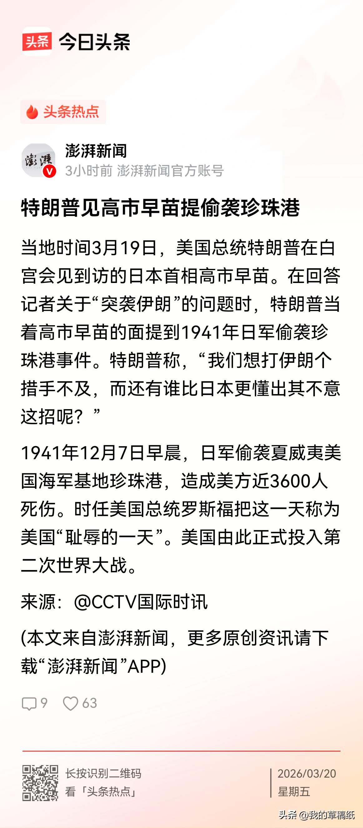 当场打脸!特朗普提珍珠港羞辱日本,美日同盟彻底露馅! 当地时间3月19日,特朗普白宫会见高市早苗,竟把突袭伊朗比作偷袭珍珠港,直言“没人比日本更懂出其不意”。一句话让日本首相尴尬失语,现场气氛诡异。 这不是口误,是美国对日本的真实态度:居高临下、毫无尊重。美日从不是平等盟友,而是主仆关系。日本在二战历史上的污点,被美国随意拿来调侃,日本只能忍气吞声。 特朗普用历史伤疤敲打日本,摆明把盟友当工具。所谓同盟,不过是美国需要棋子、日本依附强权,尊严与平等从来不存在。 春日生活打卡季