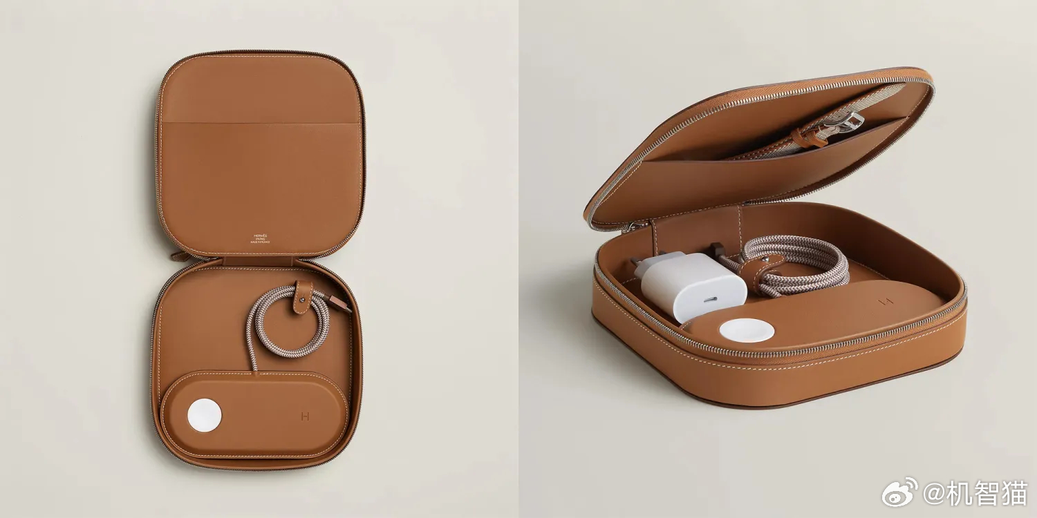 爱马仕推出了一款专门针对苹果设备的MagSafe 旅行包包含一个皮革保护套、一个二合一MagSafe 充电器(适用于 iPhone 的 MagSafe 和适用于 Apple Watch 的圆盘形充电器)以及一条配套的编织 USB-C 数据线。但是要注意,套装里面那个 20W的充电头需要自己买售价5150美元,约合人民币35537元