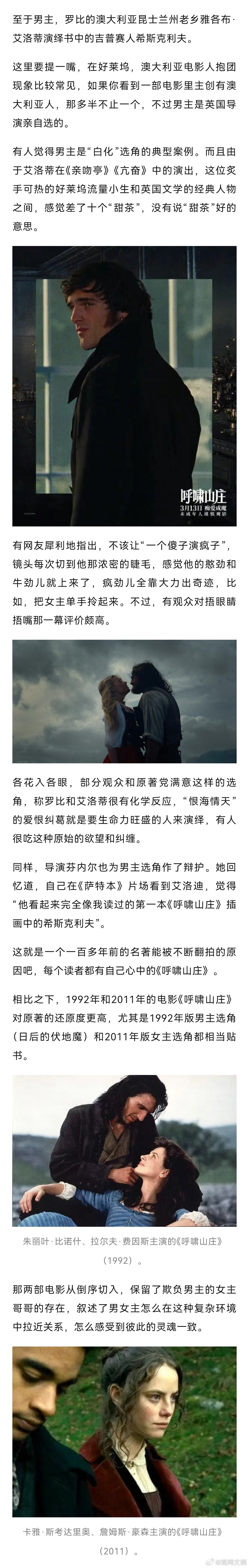 厌恶的人称该片杀伤力堪比“第一炉钢”(许鞍华版《第一炉香》)和《红楼梦之金玉良缘》,称这部最新改编完全脱离原著,毁掉了那个阴暗病态的悲剧:一个气血很足的“樊胜美”版凯瑟琳,配一个傻大个希斯克利夫,直接把“呼啸山庄”变成了“亢奋农庄”或“激情农场”,原著大量设定被改,而且男女主角爱得很空洞。