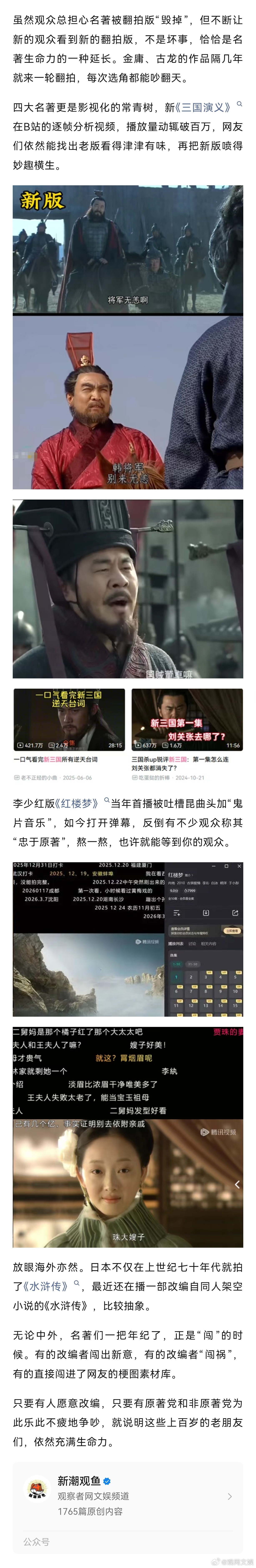 虽然观众总担心名著被翻拍版“毁掉”,但不断让新的观众看到新的翻拍版,不是坏事,恰恰是名著生命力的一种延长。只要有人愿意改编,只要有原著党和非原著党为此乐此不疲地争吵,就说明这些上百岁的老朋友们,依然充满生命力。名著们几百岁正是闯的年纪