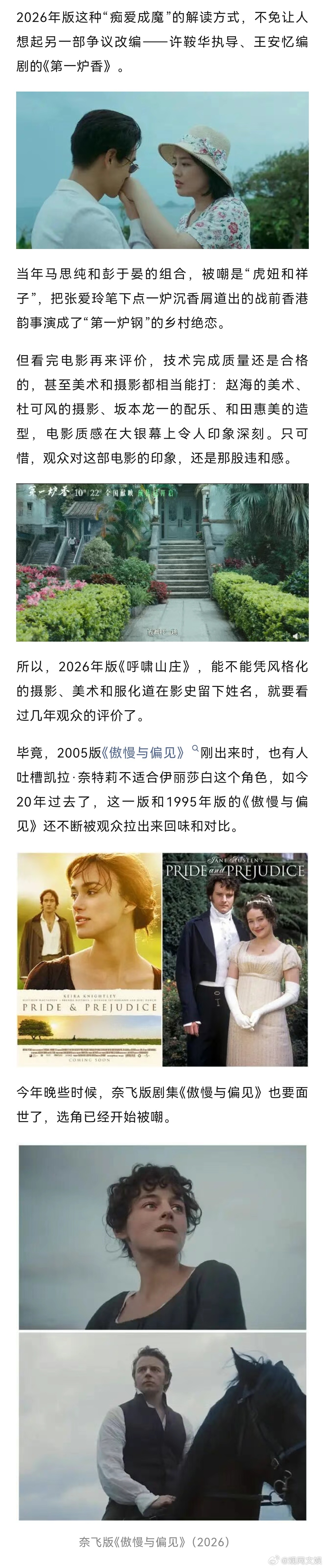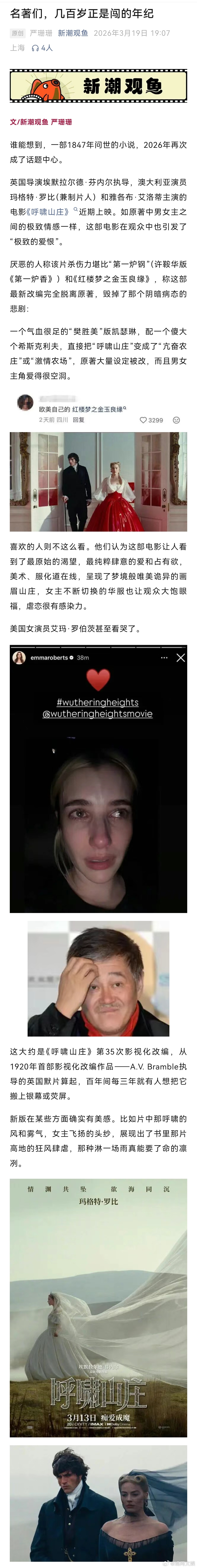 【名著们,几百岁正是闯的年纪】观众对新版呼啸山庄也有极致爱恨谁能想到,一部1847年问世的小说,2026年再次成了话题中心。英国导演埃默拉尔德·芬内尔执导,澳大利亚演员玛格特·罗比(兼制片人)和雅各布·艾洛蒂主演的电影《呼啸山庄》近期上映。如原著中男女主之间的极致情感一样,这部电影在观众中也引发了“极致的爱恨”。