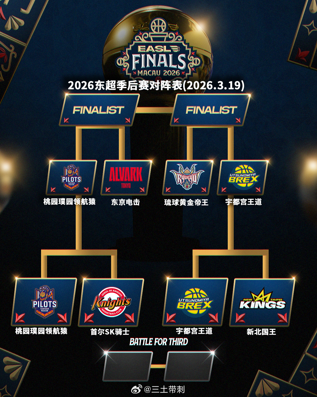 【半决赛时间】18:00 琉球黄金帝王vs宇都宫王道20:30 桃园领航猿vs东京电击