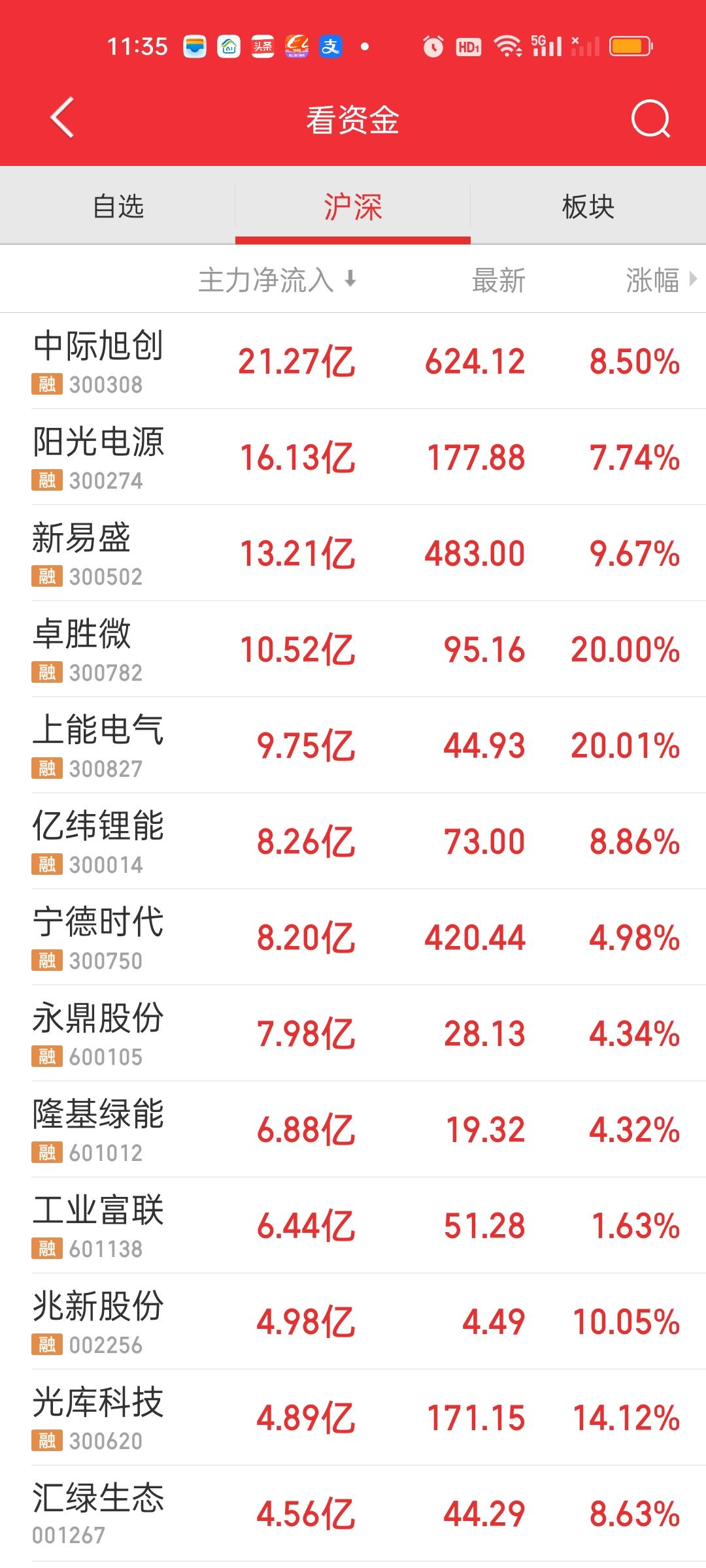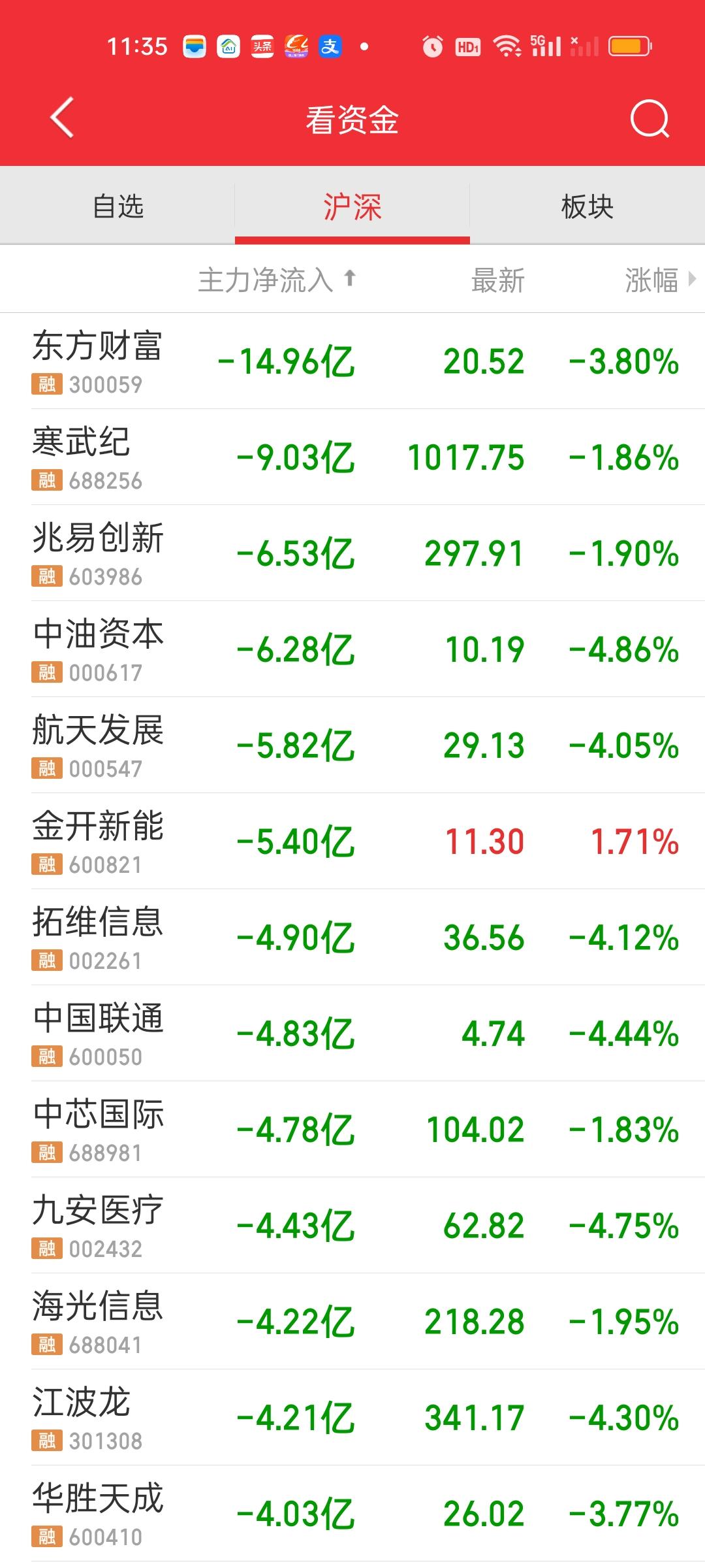 中午收盘了,事实证明只要想拉,拉起来就是分分钟的事。上证指数5分钟就拉了30个点。深指更厉害10分钟就爆拉近170个点。创业板指大涨3.30%。那到了这个时候,你还觉得大盘弱吗? 呵呵,当然弱啦!你没看到两市加起来还是有超过3200家个股是下跌的嘛?你别看中午收盘收在了4013点,你信不信下午还会下探到3975点附近。不要对大盘有不切实际的幻想,反弹起来该走还是要走,除非它能一口气站上4100点。 成交量放量到了1400亿,但大盘资金净流出的态势没有改变,依旧净流出了321.40亿。黄线还是被大盘带上去了。但不表示它就不会再下来。所以上午放量下午有可能这个量能还会缩回去。 主力资金净流入方面,中际,阳光,易胜,卓胜微净流入资金在10亿以上。主力资金净流出方面,只有东方财富净流出资金在10亿以上,寒王接近10亿。