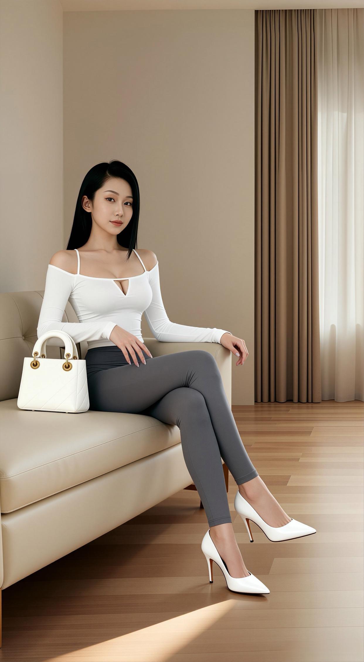 优雅气质,时尚穿搭,白色高跟鞋搭配灰色紧身裤,简约而不失优雅。