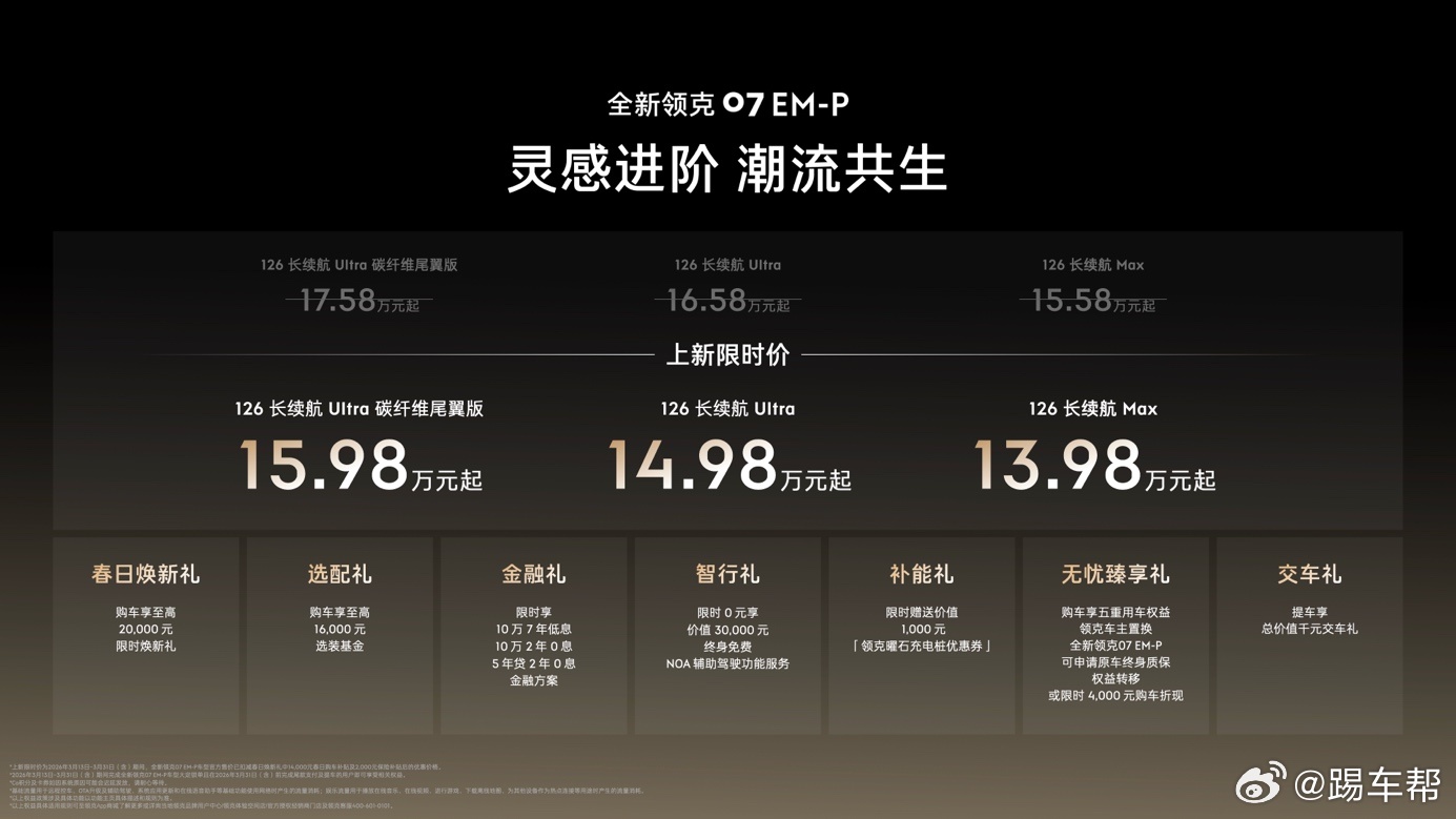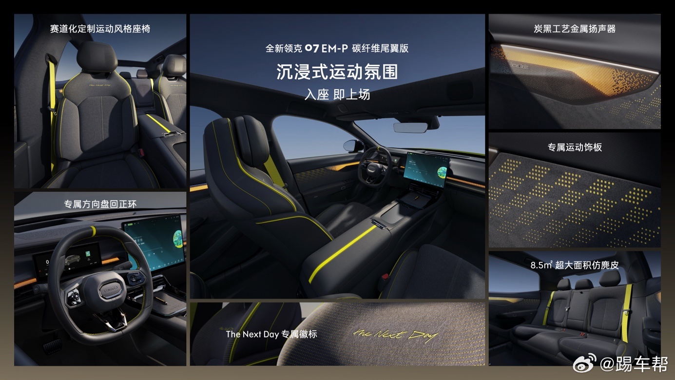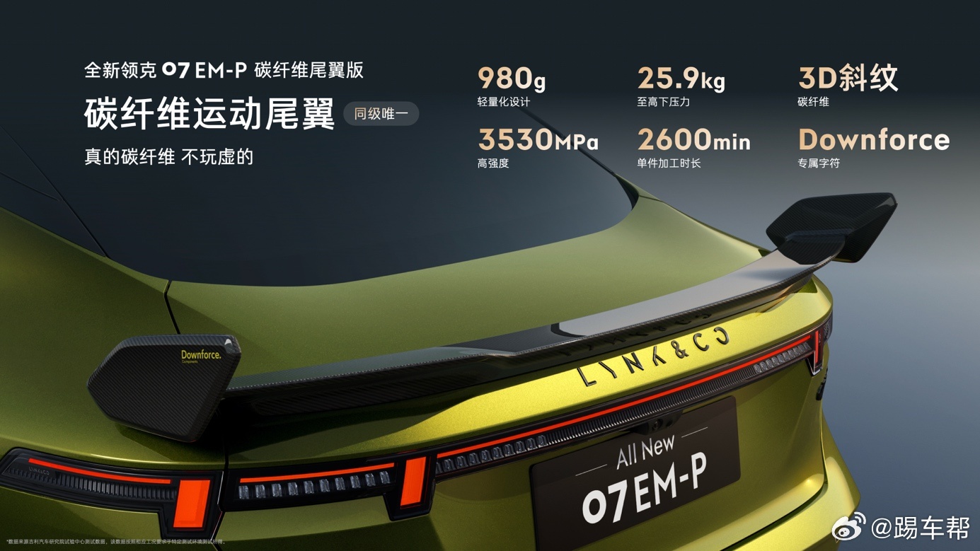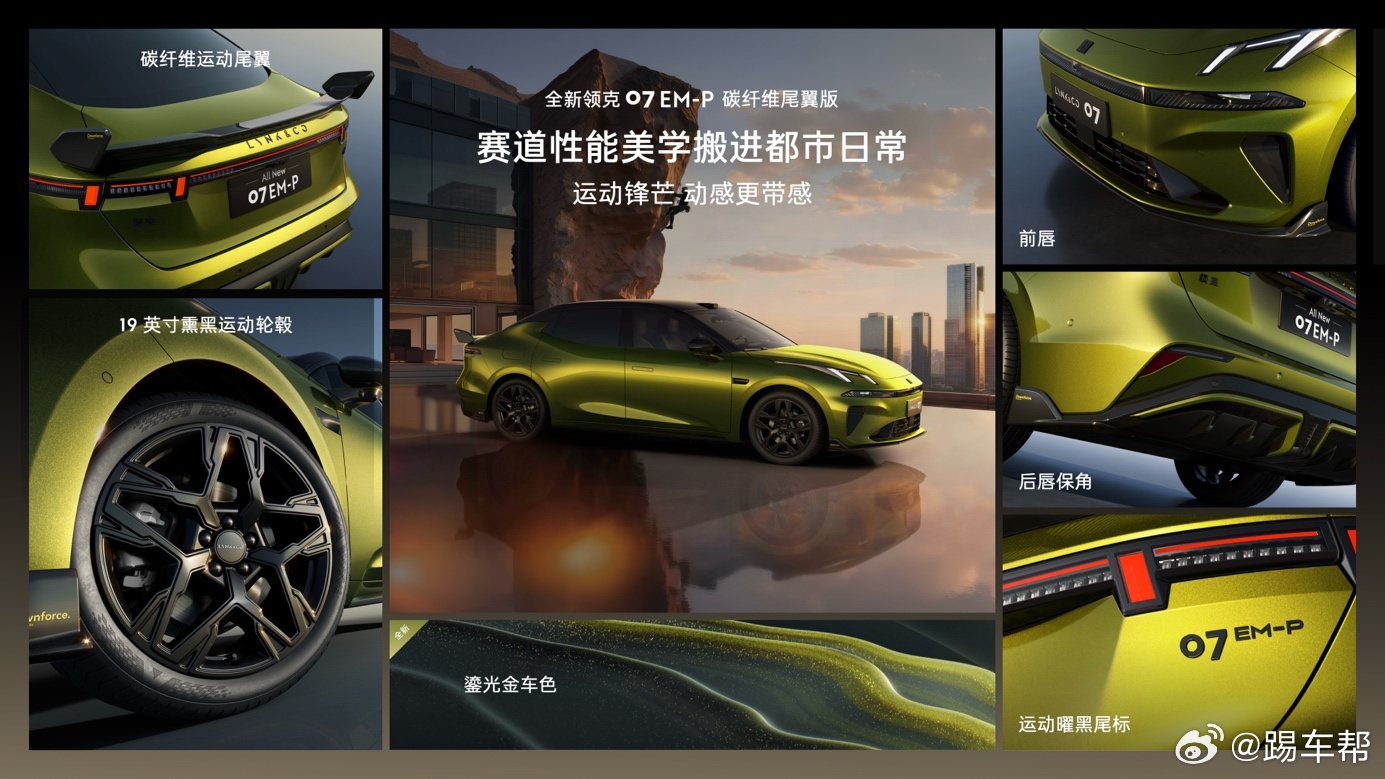领克07碳纤维尾翼版带感登场 碳纤维尾翼、鎏光金车色、运动风格座椅、熏黑运动轮毂……领克将TCR赛车7年9冠的基因带到了全新领克07 EM-P上,推出这款全新领克07 EM-P碳纤维尾翼版。
