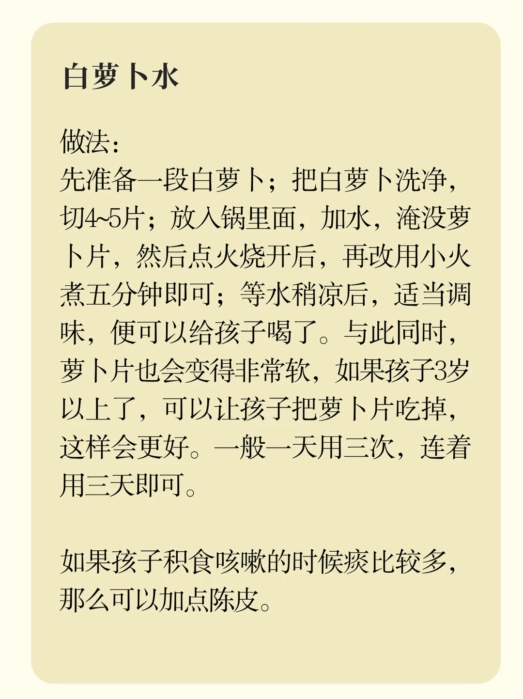 如果发现孩子有积食咳嗽,那么不妨给孩子吃点白萝卜[举手R]。白萝卜性凉,味甘辛,入脾胃肺经,能消积导滞、下气宽中、止咳化痰。白萝卜能帮助身体的气机往下降,降气的同时,就能带动身体里被堵住的痰和积食往下走,从大便排出。同时白萝卜还能清热,正好能应对积食生热的情况,中上焦的热降下来,对咳嗽也会有缓解[派对R]。