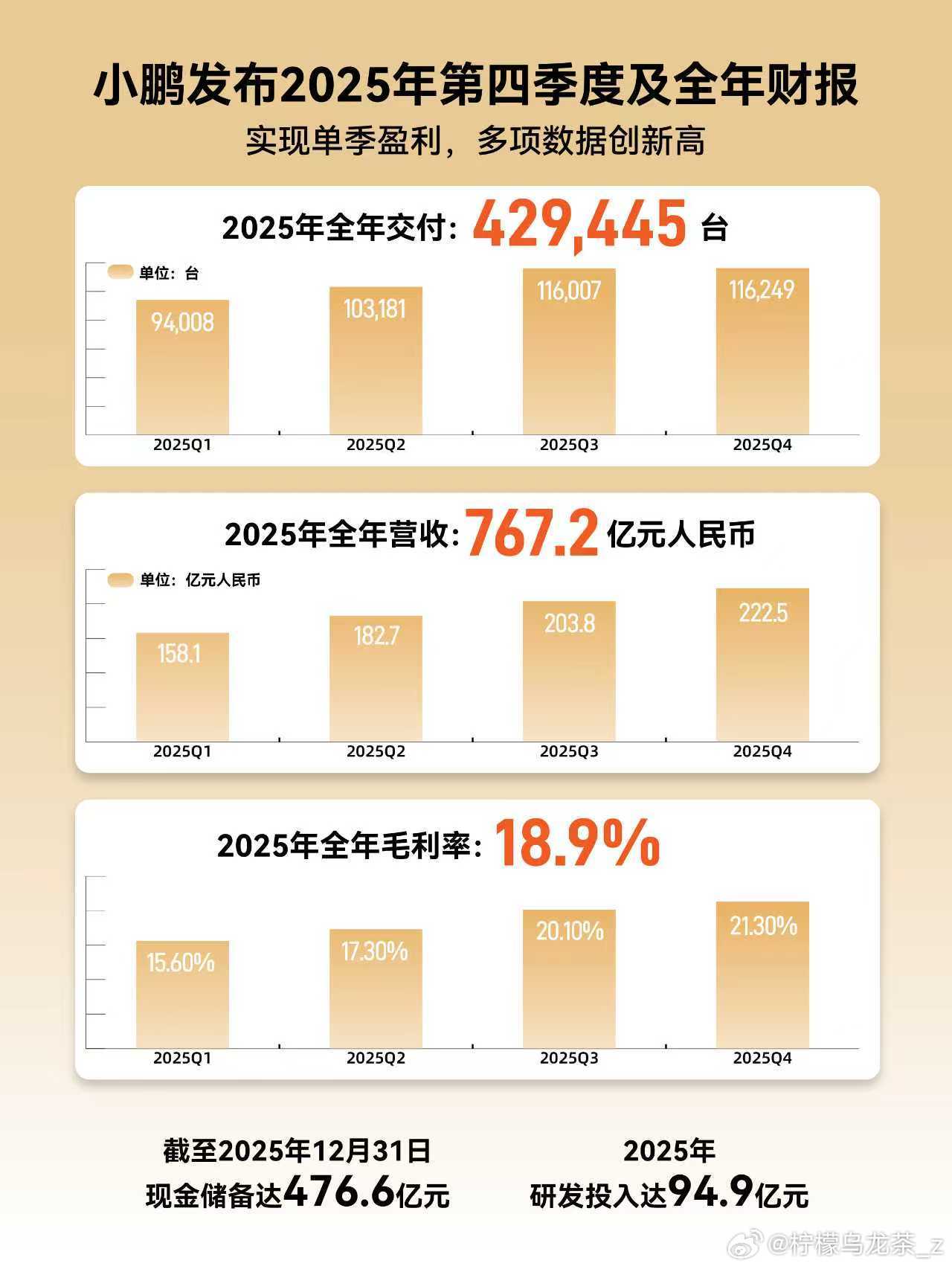 不容易啊,小鹏终于实现盈利了!从21年看到现在,经历过低谷,也有过腾飞。总之,恭喜!更期待后面的新车GX还有mona suv小鹏汽车实现首次盈利小鹏汽车2025年总营收767.2亿元小鹏2025年研发投入94.9亿元