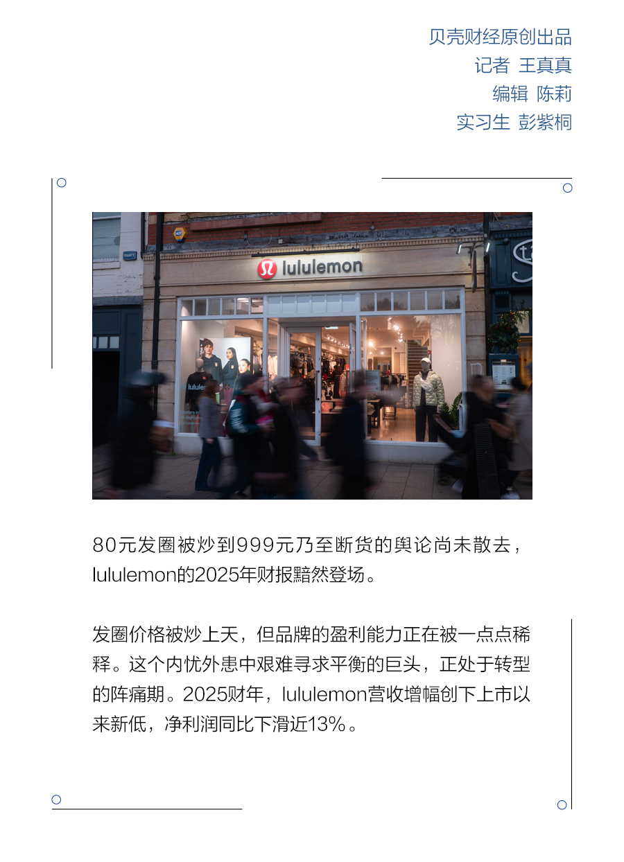 80元发圈被炒到999元乃至断货的舆论尚未散去,lululemon的2025年财报黯然登场。