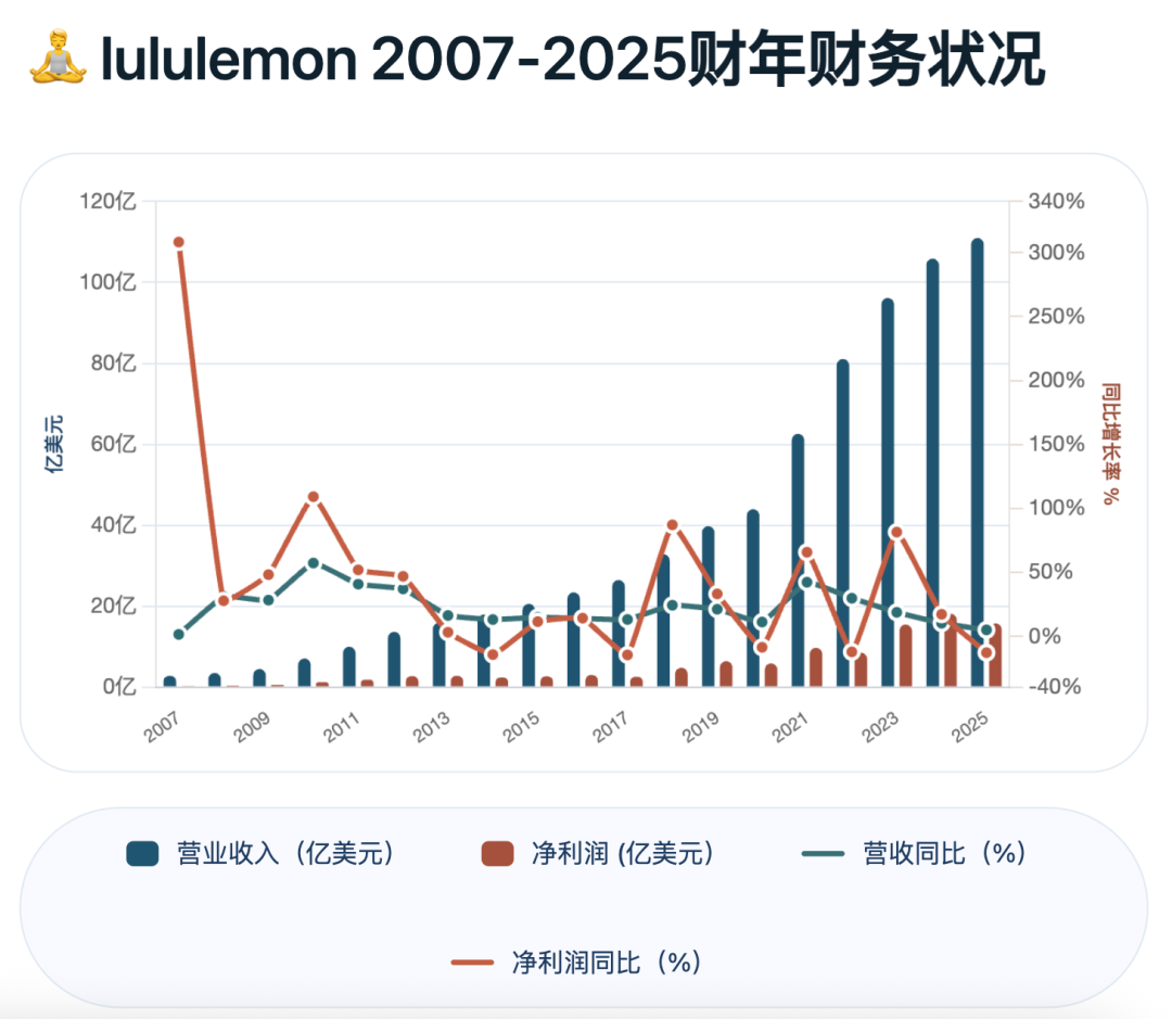 发圈价格被炒上天,但品牌的盈利能力正在被一点点稀释。这个内忧外患中艰难寻求平衡的巨头,正处于转型的阵痛期。2025财年,lululemon营收增幅创下上市以来新低,净利润同比下滑近13%。