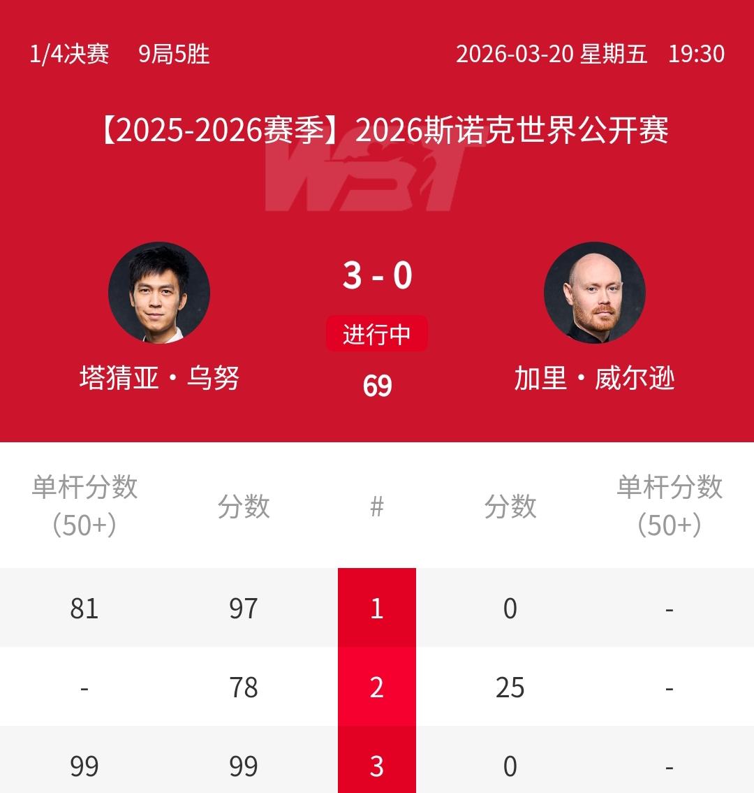 赵心童的“仇”快报了!3-0,泰国一哥塔猜亚开场打蒙三冠王威尔逊!正在进行的2026年斯诺克玉山世界公开赛,1/4决赛的一场焦点比赛中,由泰国一哥塔猜亚乌诺迎战排名赛三冠王加里-威尔逊。这场比赛,塔猜亚一上来就迅速进入状态,单杆81分取得开门红,接下来两局又连续拿下,很快取得3-0领先优势。上一轮,赵心童因为状态不佳,2-5不敌威尔逊。而这场比赛,塔猜亚则是开场碾压威尔逊。赵心童 塔猜亚