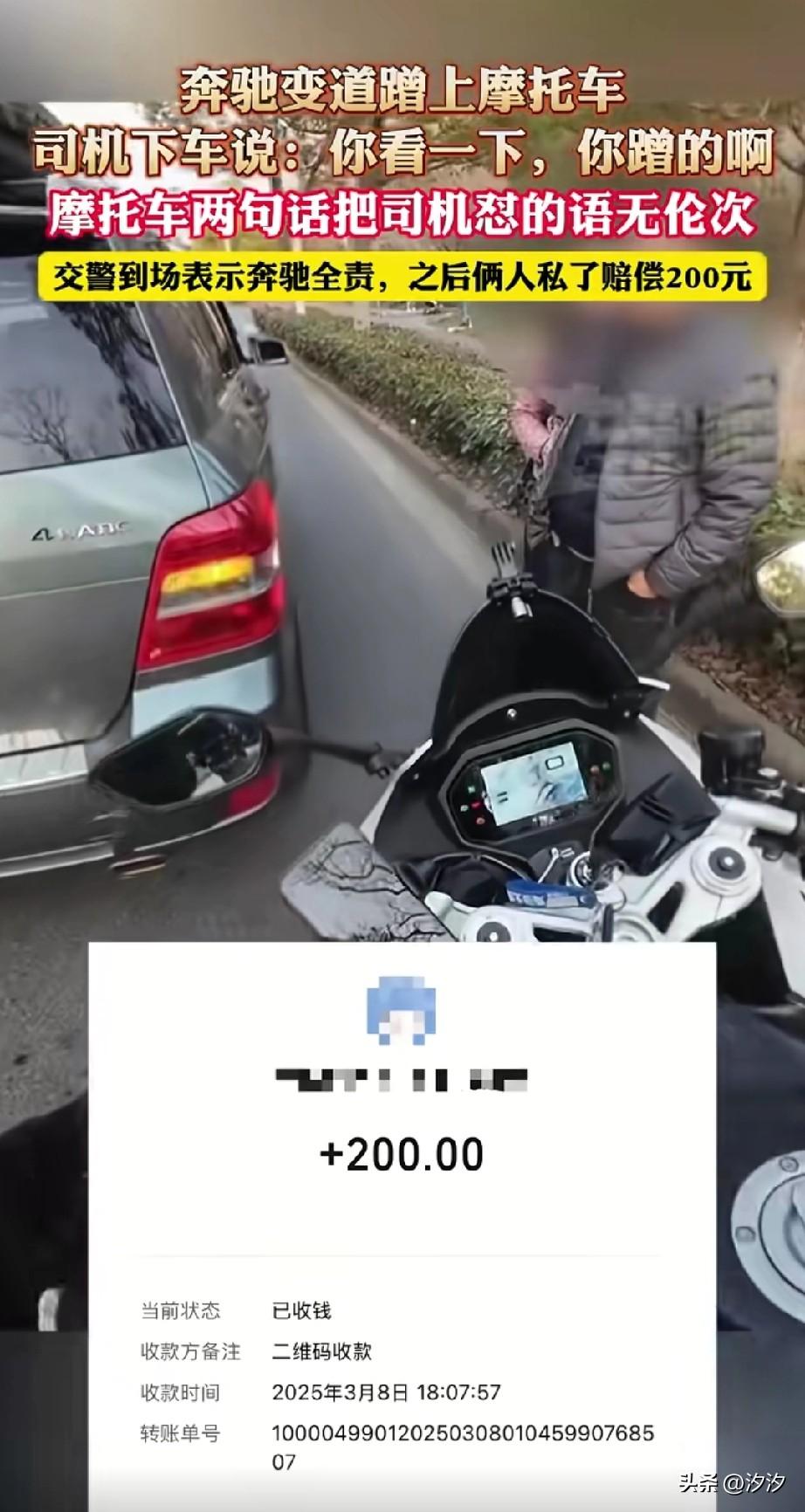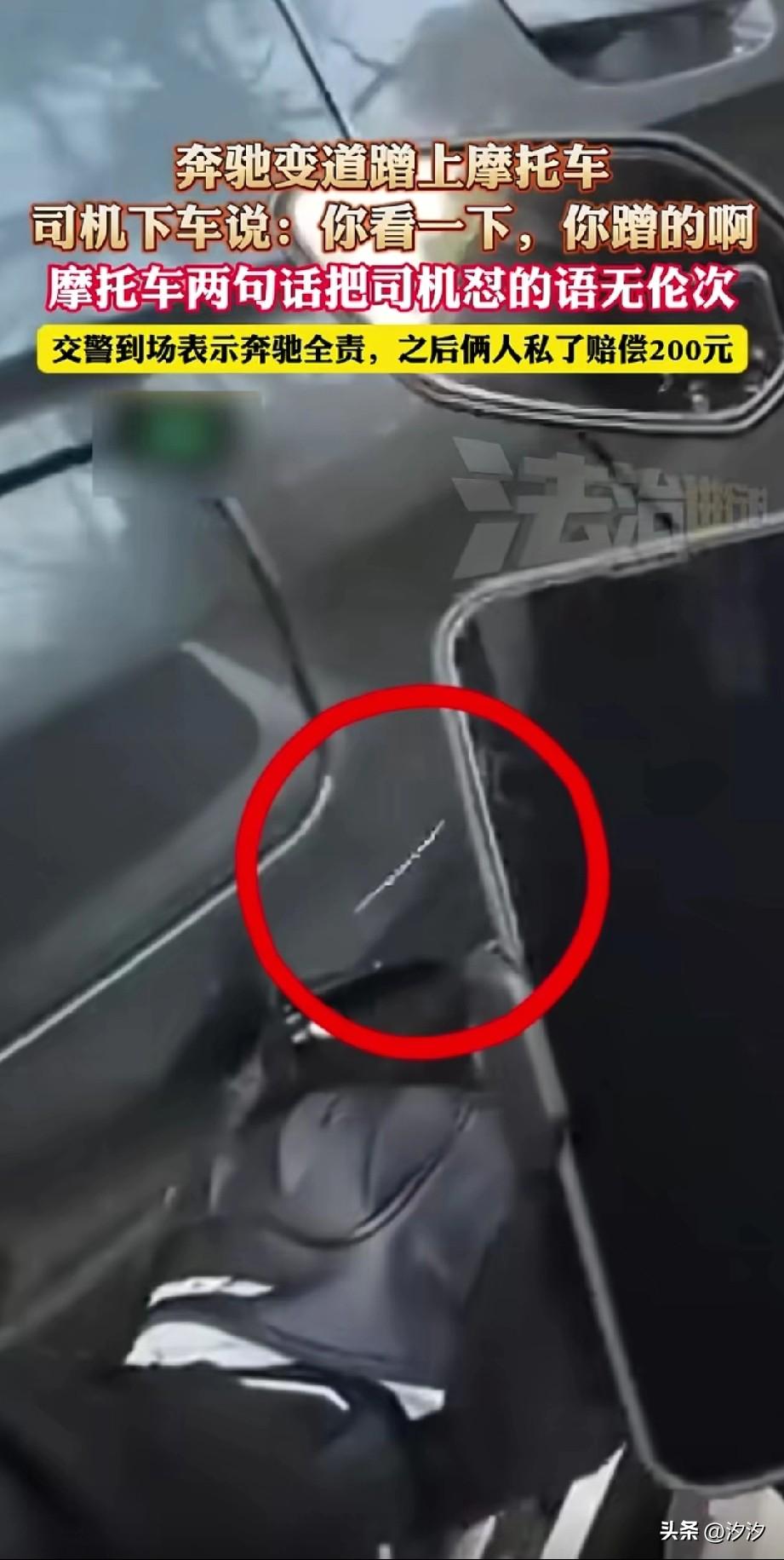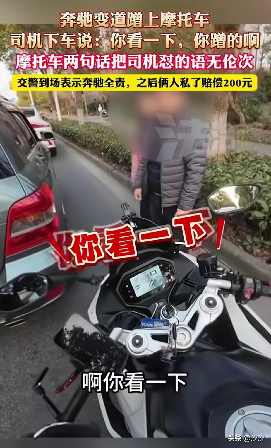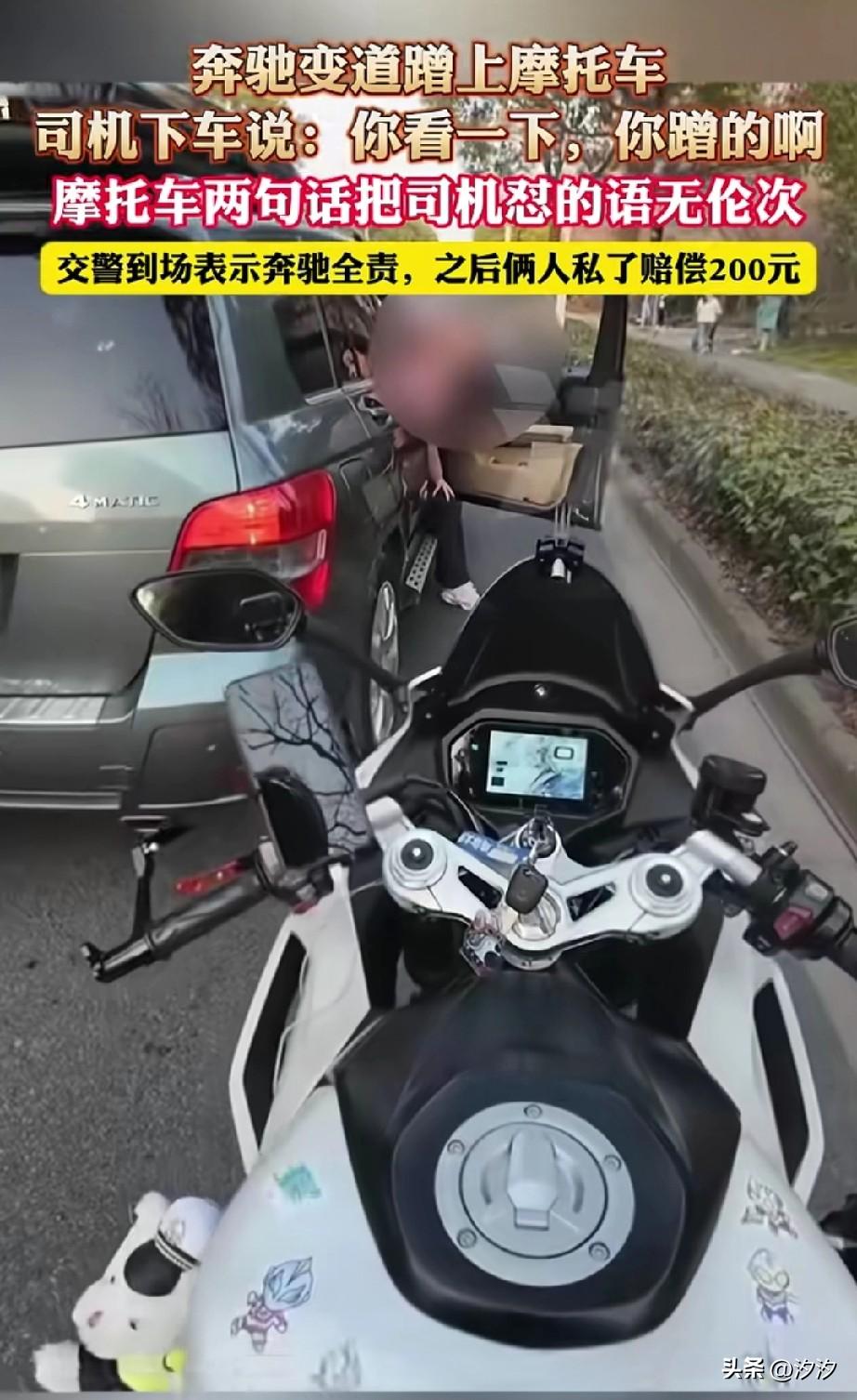 刷到这个小哥哥骑摩托车的交通事故, 当时还上了新闻, 因为小哥哥有行车记录仪, 他执行的过程中奔驰突然靠右侧变道, 这样就刮蹭了, 副驾驶下来一个女的, 还说刮蹭了呀, 最后她的老公也下车了, 上来就对小哥哥说,你碰到我了, 还让让小哥哥看一下。 因为小哥哥有行车记录仪, 直接说我不看, 不想跟他废话, 结果司机一直说你碰到我了, 大家有没有发现? 那些想赖责任的人永远都说你碰到我了,对于这种人不要和他扯, 直接打122报警就行了, 让专业的人做专业的事, 最后交警处理了事故, 小轿车司机赔了他200块钱, 有些事儿不是说他嘴硬,就是他有理, 遇到交通事故,如果不懂, 接报警就行了, 大家觉得这样做对吗?