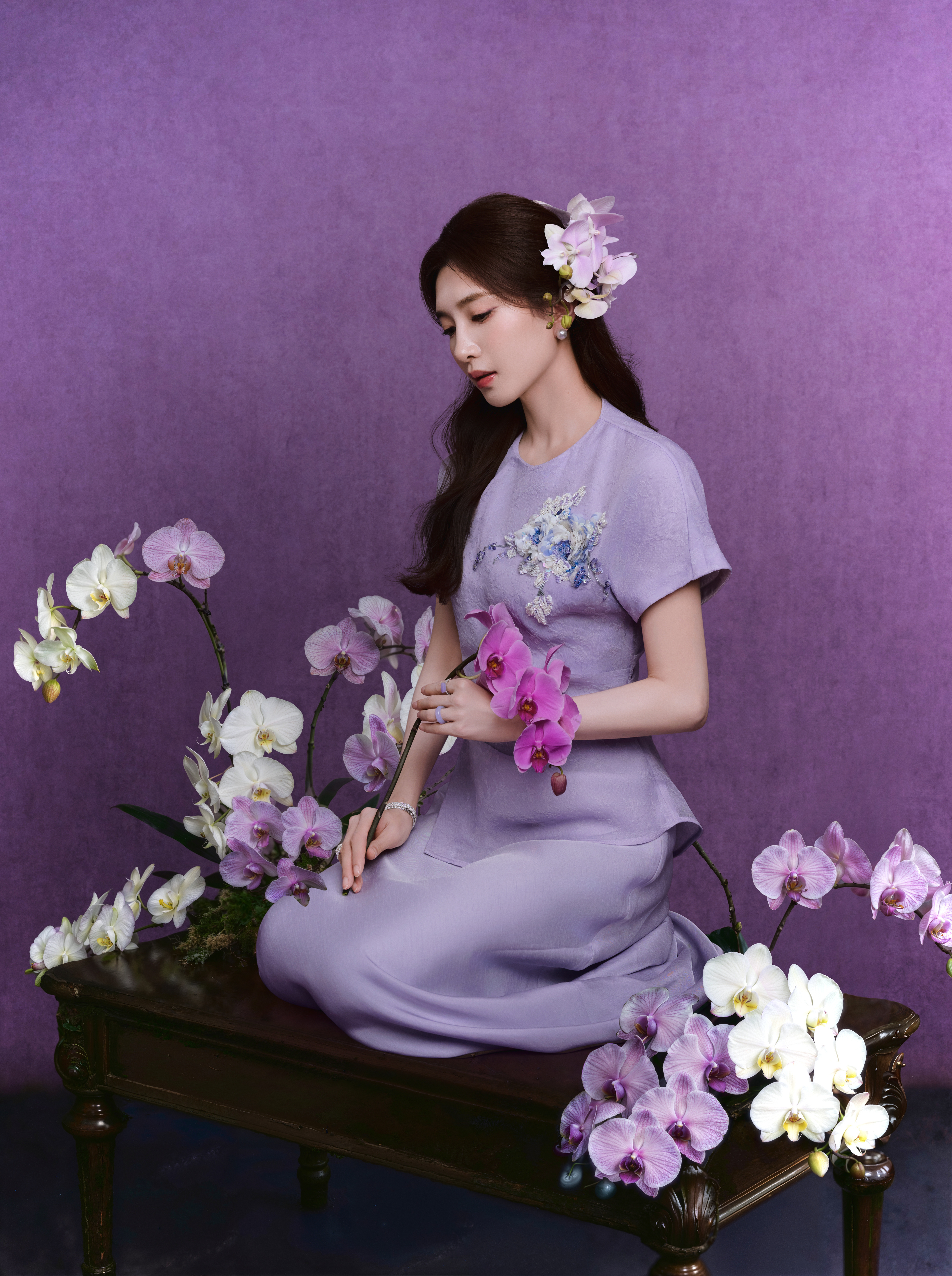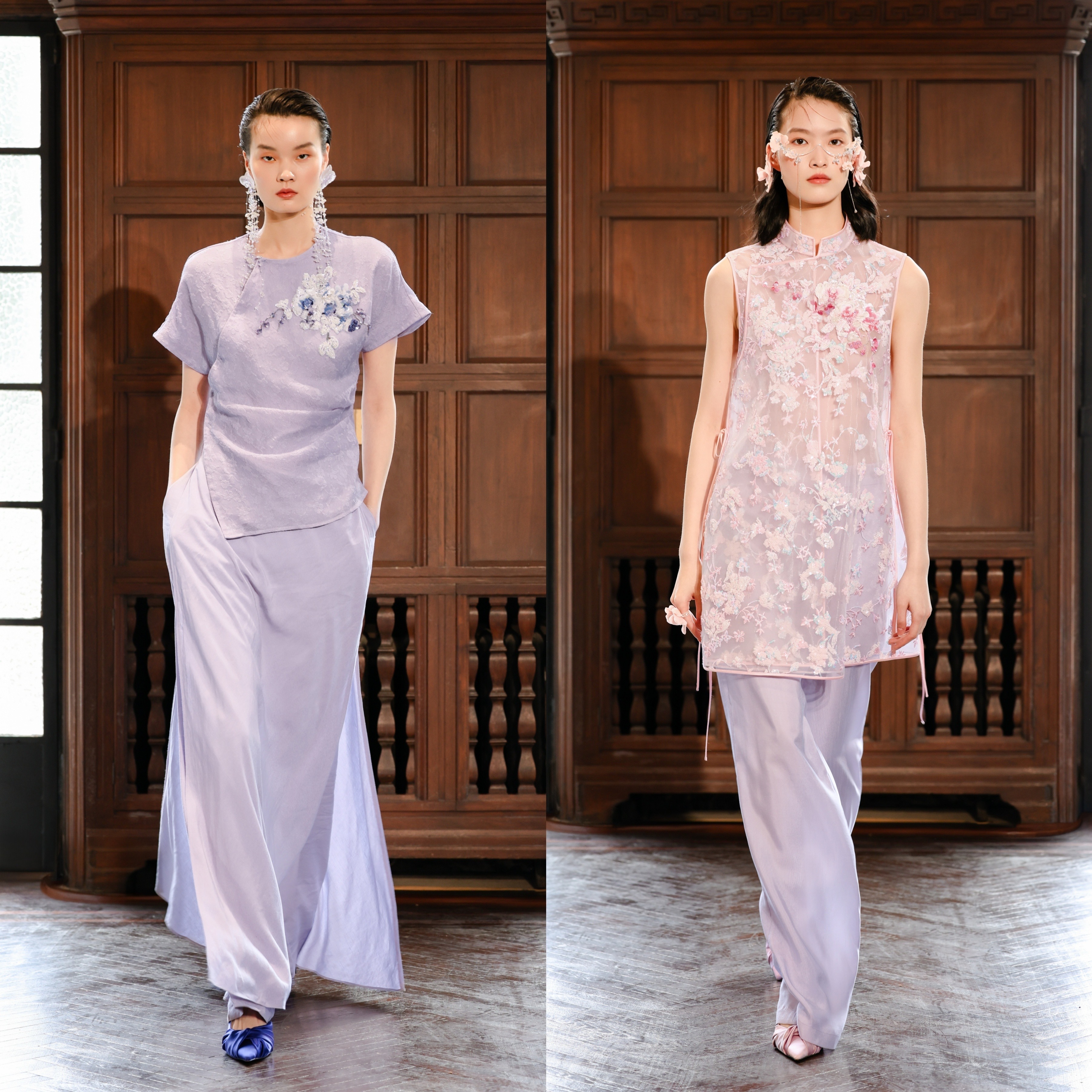 这一联名系列把蝴蝶兰化作温柔的设计语言 ,昆曲的淡雅色调 、精致的珠绣工艺 ,都让东方美学在现代剪裁里慢慢绽放 。同时秀场也迎来品牌大使江疏影的亮相 ,身着系列浅紫新中式套装,柔雾色调点缀 ,衣身手工珠绣的蝴蝶兰纹样灵动鲜活 ,将东方女性的温婉气韵与当代优雅完美融合