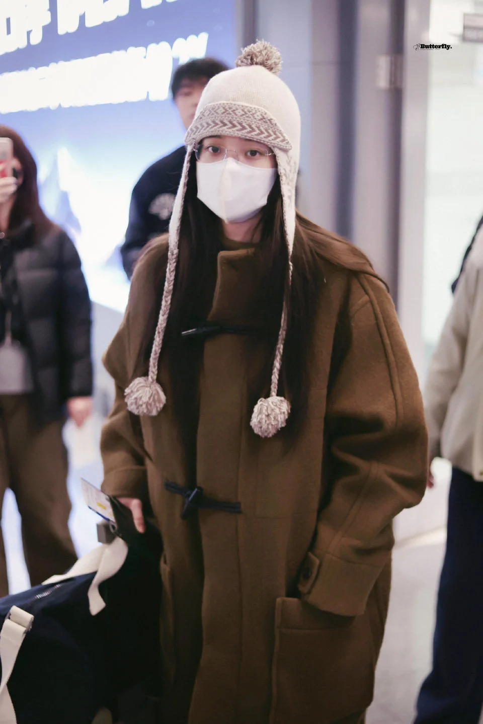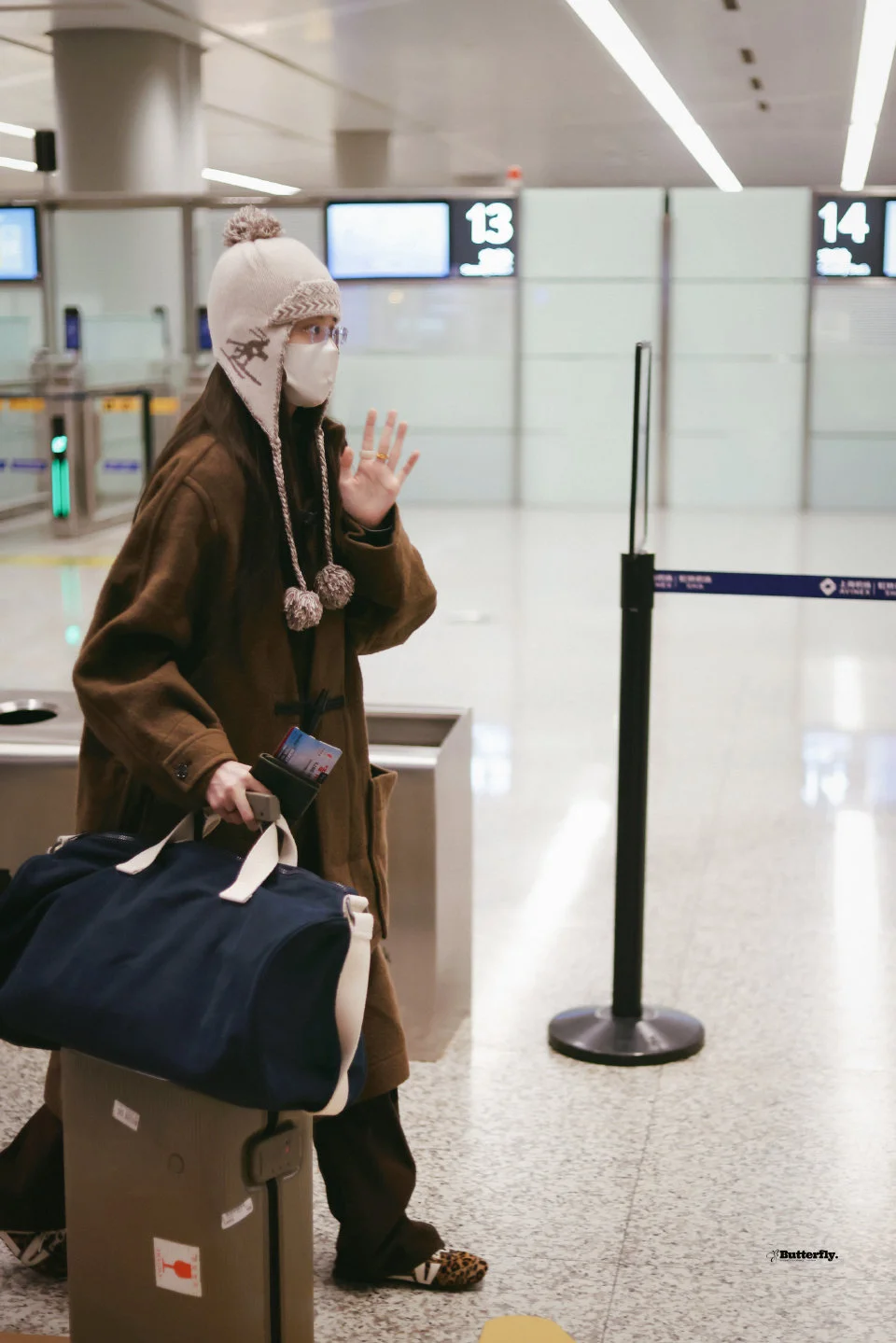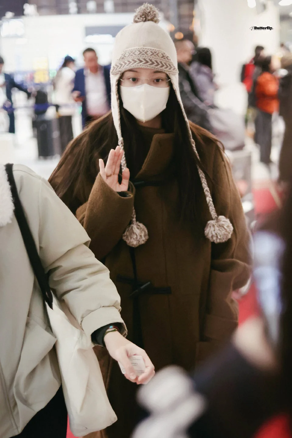 欧阳娜娜今日机场私服,长耳帽子搭配纽扣大衣,可可爱爱很女大的一身! 图片来源蝴蝶共振曲丨欧阳娜娜