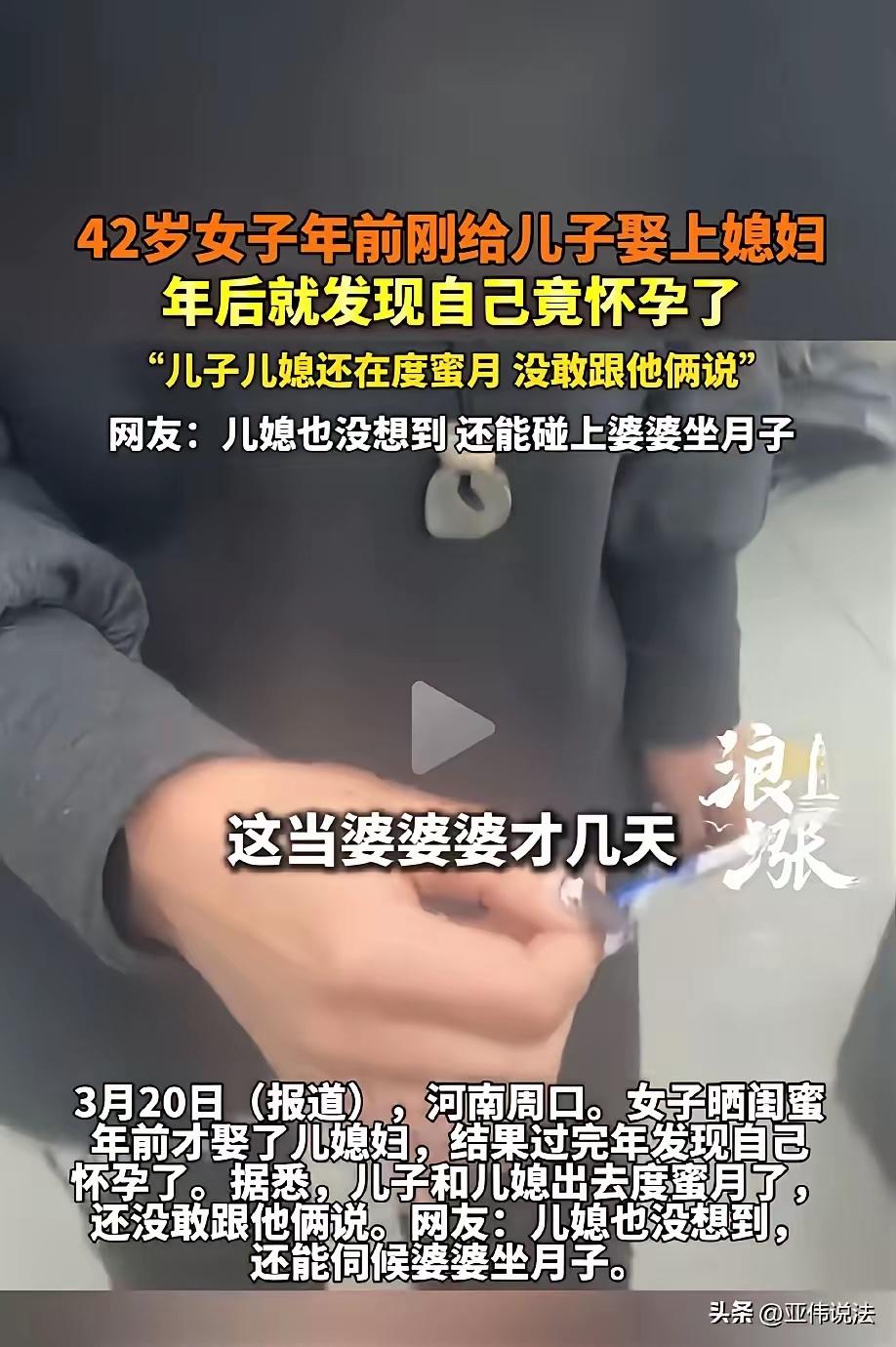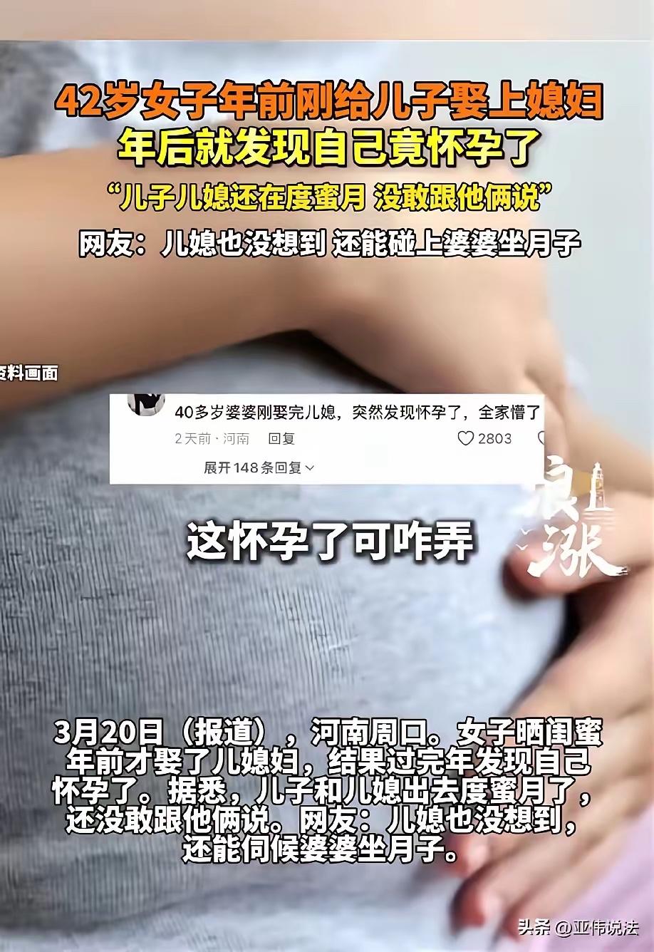 “惊不惊喜,意不意外!”河南周口,42岁女子刚给儿子娶完媳妇,当婆婆还不到一个月,突然发现自己怀孕了。她左右为难,儿子和儿媳还在度蜜月,纠结怎么把这个消息告诉他们。网友忍不住吐槽:儿媳妇估计也想不到,还能给婆婆伺候月子。 周口一位42岁的大姐,遇上了一件又惊喜又为难的事,这个年纪怀孕,她实在有点不知所措。 年前,大姐忙前忙后,终于把儿子的婚礼办得风风光光,把儿媳妇顺顺利利娶进了门。那段时间她起早贪黑操持家事,连自己身体出现细微变化都没放在心上,只当是操办婚事过度劳累,压根没往怀孕这方面想。直到婚礼结束,家里恢复平静,她才察觉到身体不对劲,抱着试探的心态检查后,结果让她当场愣住——自己真的怀孕了。 这个消息来得太过突然,让她瞬间陷入两难。一边是刚组建小家庭、正沉浸在蜜月甜蜜里的儿子儿媳,一边是自己腹中意外到来的小生命,她思来想去,始终不知道该如何开口。她怕儿子觉得尴尬,更怕刚进门的儿媳心里不舒服,毕竟婆媳同住一个屋檐下,婆婆怀孕生子,在很多人眼里都是件难以接受的事。 她不是没有过放弃的念头,可毕竟是一条鲜活的小生命,夫妻二人思虑再三,还是决定留下孩子。可随之而来的难题更棘手,怎么跟晚辈坦白,成了压在她心头最大的石头。她甚至偷偷躲在家里发愁,担心儿媳得知消息后会产生隔阂,担心邻里街坊说三道四,更担心自己高龄怀孕带来的身体风险,以及后续抚养孩子的压力。 在农村和普通家庭的观念里,婆婆和儿媳几乎同时处于生育年龄段,本就容易引发家庭矛盾,更何况她刚当上婆婆不足一月,身份转换快到让她自己都难以适应。一边要学着做好婆婆的角色,照顾小两口的生活,一边又要以孕妇的身份被照顾,这种双重身份的冲突,让她整日坐立难安。 这件事在网上传开后,立刻引发了网友的激烈讨论。有人觉得高龄生子风险太大,还要考虑抚养精力和家庭经济压力,完全没必要;也有人表示理解,认为生育是夫妻二人的权利,只要家人商量妥当,外人无权干涉。而最被大家调侃的,就是刚进门的儿媳,不少人开玩笑说,儿媳蜜月回来就要面临和婆婆同期待产、甚至互相伺候月子的局面,实在太过戏剧性。 但调侃归调侃,这件事的核心,其实是家庭沟通与观念包容的问题。42岁属于高龄孕产妇,本身就面临妊娠高血压、糖尿病等诸多健康风险,大姐愿意留下孩子,必然是和丈夫深思熟虑后的结果,她真正需要的,不是外界的议论,而是家人的理解与接纳。 儿子和儿媳作为年轻人,若能放下世俗偏见,体谅父母的心意,家庭就能和睦安稳;若是心存芥蒂,很容易因此滋生婆媳矛盾,让原本和美的家庭生出嫌隙。而这位大姐的纠结与忐忑,恰恰道出了普通中年人面对意外生育时的真实困境,既要顾及亲情,又要面对现实压力,还要扛住外界的眼光。 其实生育从来都是个人与家庭的选择,无关年龄,更无关外界的评判。只要一家人能达成共识,互相体谅,再棘手的局面也能慢慢化解。比起网友的调侃,家人之间的包容与支持,才是解决这件事最关键的钥匙。 各位读者你们怎么看?欢迎在评论区讨论。