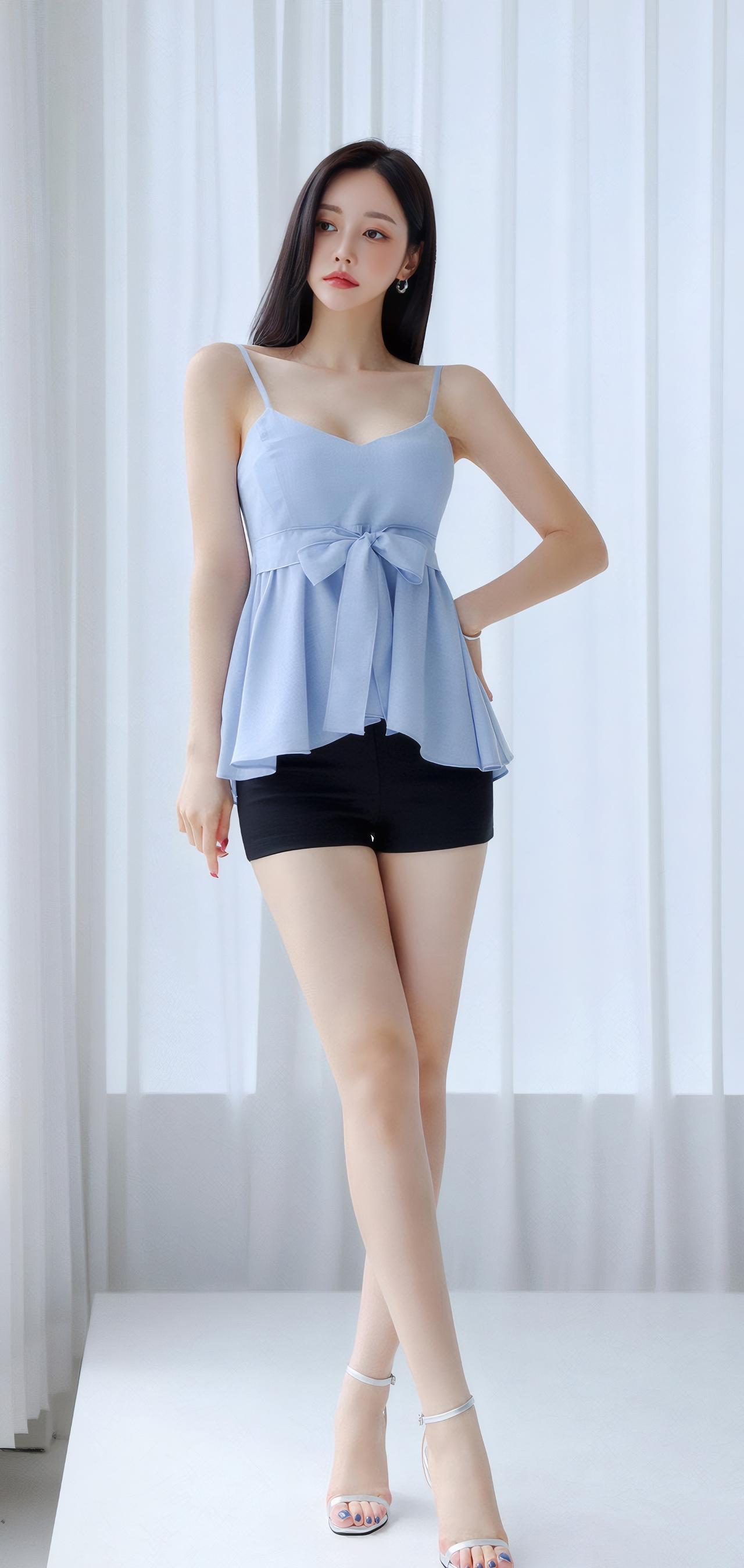 清新夏日穿搭,浅蓝色荷叶边上衣搭配黑色短裤,优雅又时尚!