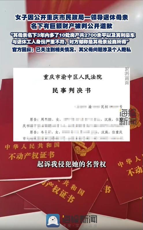 重庆,一女子发现某退休男子的母亲名下3年内突增10套共2700多平房产,价值几个亿,还有宾利豪车,觉得这事有些蹊跷,李女士觉得不对劲就举报了,没成想举报被下架,还被起诉要求公开道歉。官方回应说这是老人隐私,对方称财产是经商赚的,李女士拿不出证据,最后败诉了。 老人是重庆市民政局一名退休干部的母亲,本身只是拿着固定退休金的普通工人,一辈子靠工薪度日,没有公开的经商履历,也没有能支撑巨额财富的合法高收入来源,可就是这样一位本该安享晚年的老人,名下资产却在三年内迎来爆发式增长。 十套房产遍布城区,总面积远超普通家庭的想象,按当下重庆楼市行情估算,整体价值直奔数亿元,再加上豪华轿车加持,这份资产与老人的退休身份形成了刺眼的反差。 李女士越琢磨越觉得蹊跷,普通退休老人别说积攒数亿家产,就算是购置一套改善房都要精打细算,如此巨额财富的来源实在难以用常理去解释。 抱着查清疑点、守护公平的想法,李女士通过正规渠道发起举报,希望相关部门能介入核查这笔财产的合法性,可她的举报之路从一开始就布满荆棘。 最初发布的举报内容很快遭到投诉下架,发声渠道被堵死不说,涉事干部及其母亲还以侵犯名誉权、隐私权为由,将李女士告上了法庭。 庭审过程中,涉事干部坚称母亲名下的巨额财产,都是老人经商所得,属于合法的个人收入,而李女士因为无法拿出直接证据证明财产存在问题,最终没能得到法院的支持。 当地法院审理后认定,李女士的举报行为构成侵权,判决她向涉事双方全网公开赔礼道歉,且道歉视频需要保留足够时长不得删除。 面对这样的结果,李女士满心不解,她只是对反常财产提出合理质疑,想要一个清晰的真相,却从举报人变成了侵权人,而针对这笔数亿资产的来源,始终没有得到彻底的核查与公示。 针对此事,相关部门给出的回应更是将舆论推向高潮,工作人员表示,李女士反映的问题并非涉事干部的工作范畴,而是其父母的个人隐私,不便过多介入核查。 这样的回应并没有平息公众的质疑,反而让越来越多的网友加入讨论,大家普遍认为,隐私不能成为掩盖疑点的挡箭牌,公职人员近亲属的异常财产,理应接受公众与监管部门的监督。 公民行使监督权,本身就是推进社会公平、防范腐败滋生的重要力量,李女士的举报或许不够严谨,没能拿出确凿证据,但她提出的疑点并非空穴来风,这份对反常现象的较真,不该被全盘否定。 法律确实要保护公民的隐私权与名誉权,任何人都不能在没有证据的情况下随意诽谤他人,但当公职人员亲属的财产出现明显反常、与身份严重不符时,单纯以“隐私”为由拒绝核查,只会透支公众的信任。 涉事方称财产为经商所得,却没有公开相关的经商轨迹、收入凭证等佐证材料,空泛的解释根本无法打消大众的疑虑,数亿家产不是小数目,退休老人的“经商奇迹”,更需要拿出实实在在的依据来支撑。 李女士举报官员母亲财产案,看似是一场输赢已定的民事官司,实则是对监督边界与公信力的双重考验。 我们既不能纵容无底线的造谣诽谤,也不能让合理的监督声音被淹没,更不能让异常财产在“隐私”的庇护下蒙混过关。 只有把财产来源查清楚、晒明白,用实打实的证据回应质疑,才能既守住法律的底线,维护公民的合法权益,也守住公职人员的廉洁底线,守护住公众对公平正义的期待,这才是破解这场舆论争议的唯一出路。