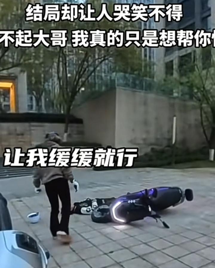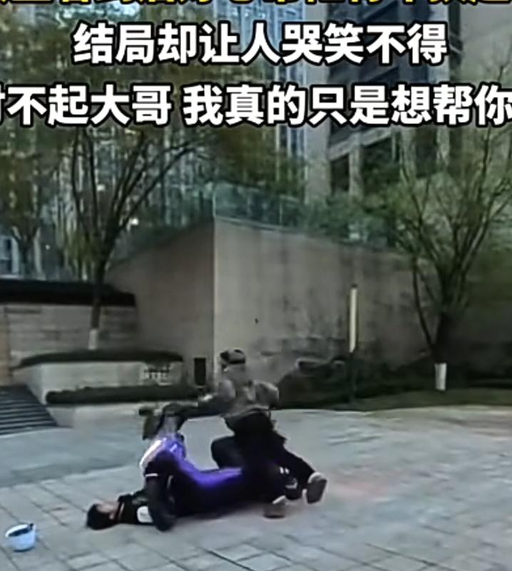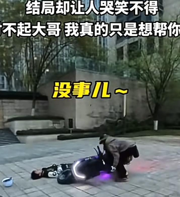 3月19日重庆一名电动车男孩不慎摔到,头盔拋出2米远,整个人躺在地上欲哭无泪,感叹苍天啊大地啊幸亏没事,路过的一名女子看到后善心大发,于是停车过去帮扶,问道:怎么了大哥?男子语气缓和的说没事让我缓缓就可以了,老妹也不多勉强就说:那我帮你把车扶起来吧!男子感激涕零的说:谢谢啊!老妹也不假思索的就去扶车,谁知一个重心没站稳,连车带人又倒下了,随着男子的一声惨叫不偏不倚的刚好落了一个满怀,女子也被突如其来的状况带了一个四仰八叉,那场面别提了。 本来只是一个摔倒这下变成了栽跟头,本来不需要去医院的这下两人都得去静养几天,或许会变成一段美丽的邂逅。