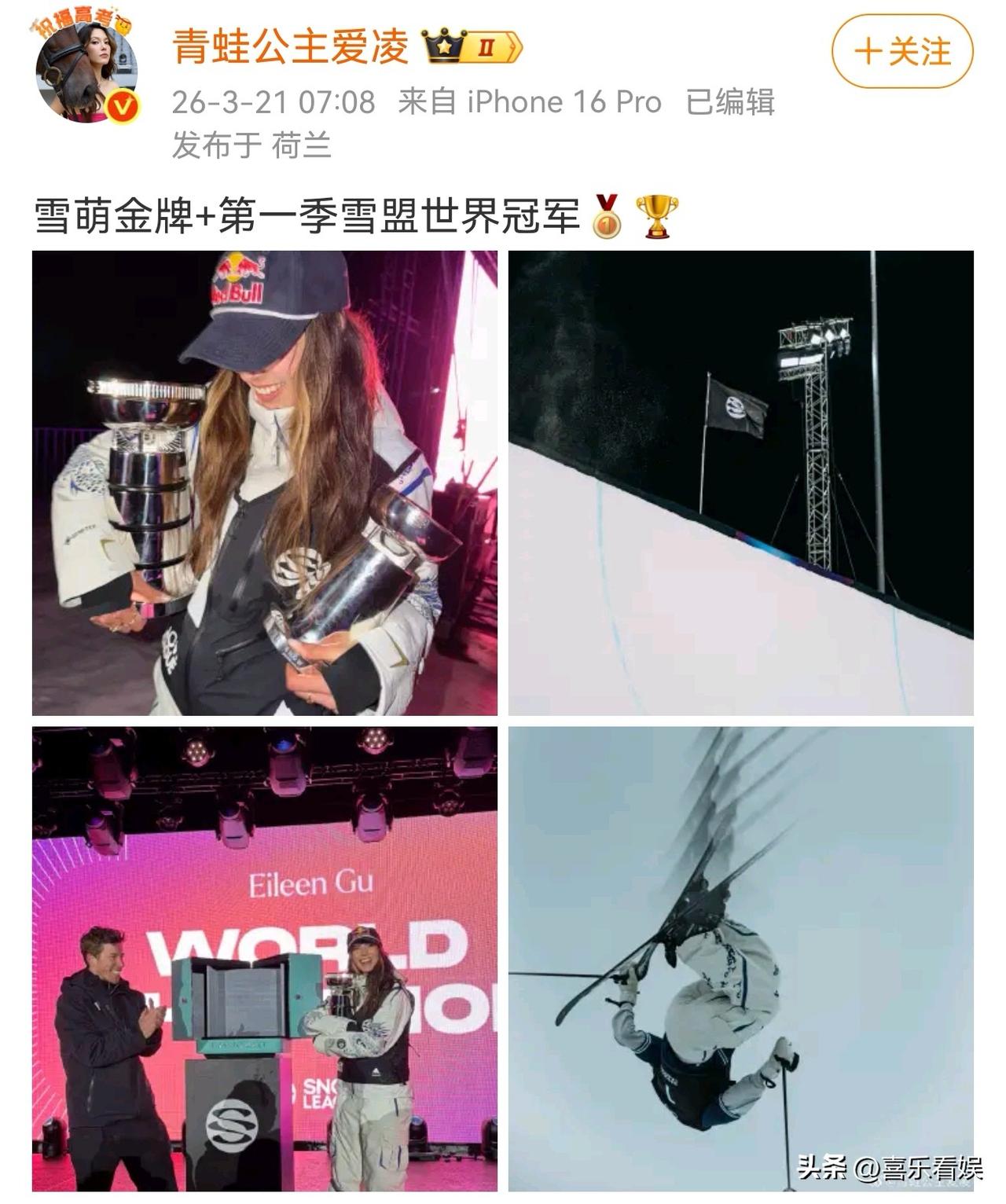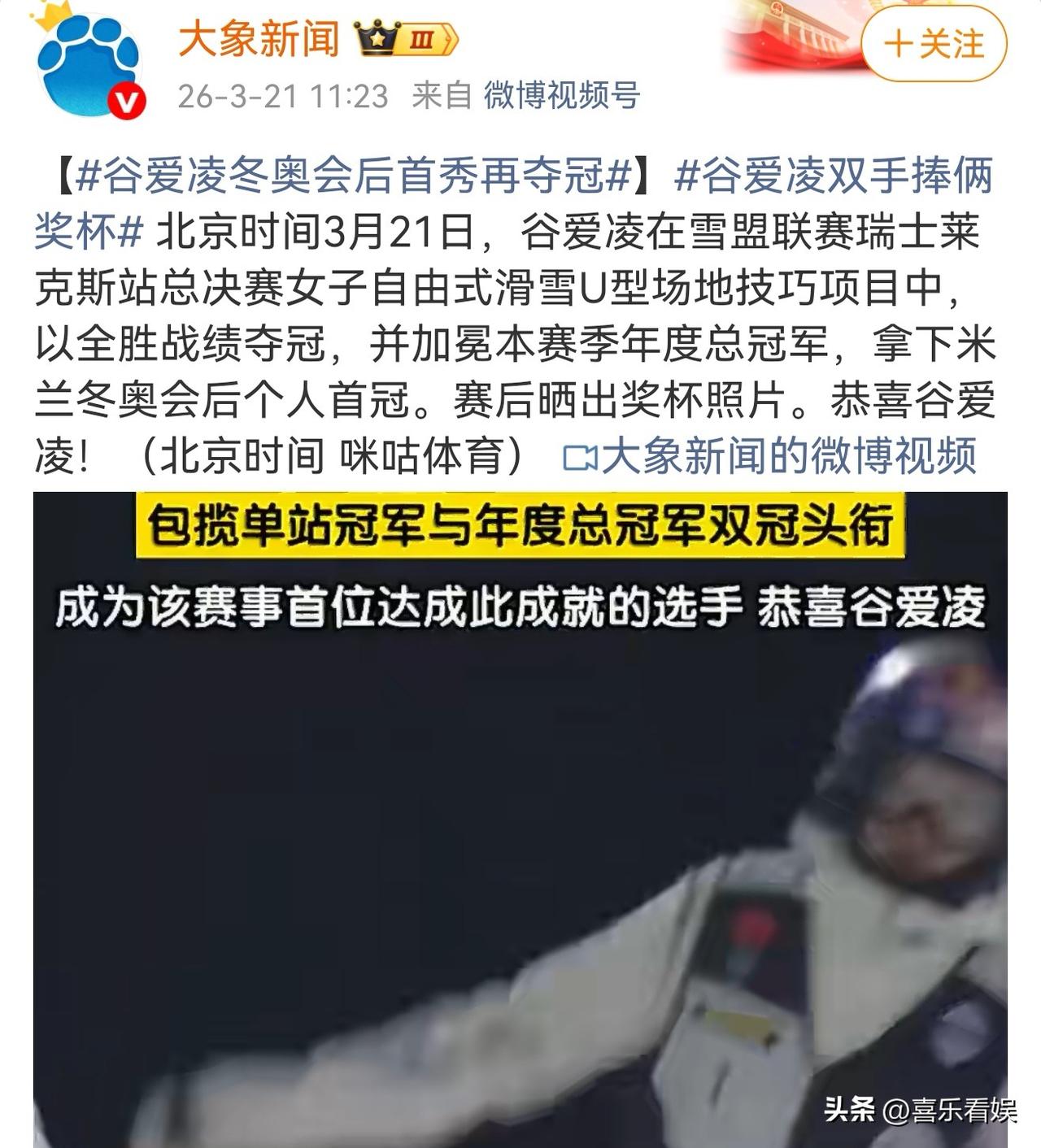 谷爱凌,这实力真的没得说! 3月21日,谷爱凌冲上了热搜,原因是她在个人社交平台上分享了一则好消息,她又夺冠了。 这次是她在米兰冬奥会后的首秀,在雪盟联赛瑞士莱克斯站总决赛的女子自由式滑雪U型场地技巧项目里,她直接拿下了单站冠军。 还顺便加冕了本赛季的年度总冠军,双手捧着两个奖杯的样子也太飒了。 更厉害的是,她还成了这个赛事里首位达成双冠成就的选手,这实力真的没得说。 赛后,她谷爱凌自己也在社交平台开心分享这份喜悦,配文说拿下了雪萌金牌和第一季雪盟世界冠军,满屏都是她的喜悦感。 而网友们也都被她这份好成绩再度圈粉了,评论区里全是满满的祝福。 有人说“又创造了历史,太最棒了”,也有人感慨“天道酬勤实至名归”,毕竟谷爱凌在赛场上的每一次出色表现,背后都是无数的努力和付出。 赛场上的她是敢拼敢闯的滑雪健将,每一个腾空、每一个动作都精准又漂亮,赛场下的她也依旧耀眼,用实力一次次刷新大家的认知。 从冬奥赛场上的惊艳亮相,到这次赛后首秀再续辉煌,谷爱凌真的用实力证明了自己的优秀。