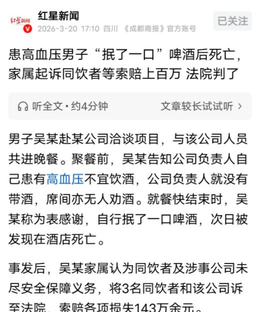 “讹天讹地讹空气!”陕西渭南,男子去一公司谈项目,告诉对方自己有高血压,吃饭时,无人劝酒,结束时男子主动抿了一口啤酒表示感谢,次日,男子竟在酒店意外身亡。家属将3名同饮者和公司告上法院,索赔143万,法院作出公正判决。 2023年5月15日,渭南发生了一起让人唏嘘的案子,有个叫吴某的男士,到当地一家公司去谈生意,对方挺客气,为了方便他来回跑和休息,提前就在酒店给他把房间开好了。 当天下午,正事谈完了,公司负责人为了尽地主之谊,就叫上了几个员工和客户,一共9个人,准备晚上一起吃个饭,在入座之前,吴某特意跟大伙打了个招呼,说自己有高血压的老毛病,平时不能喝酒,希望大家能理解。 主办方一听这话,那必须得尊重人家的身体情况啊,本来准备好的白酒直接就撤了,谁也没劝谁喝,整场饭局下来,只有一位工程师稍微有点馋酒,点了几瓶啤酒,三四个人分着喝了点,最后还剩了一瓶多没动。 全程没人给吴某递过酒杯,更没人起哄敬酒、劝酒,大家都记着他的身体状况,气氛那是相当和谐,既给面子又讲礼貌。 吃到快结束的时候,吴某觉得这次合作谈得挺顺利,对方招待得也周到,自己一点都不喝好像有点过意不去,想主动表示一下感谢。 于是他自己拿起小酒杯,倒了大概三分之一的啤酒,轻轻抿了一口,算是尽了心意,那一小口之后,他就再没碰过酒杯。 到了晚上八点左右,饭局散了,公司特意安排人把吴某安全送回了酒店房间,确认他状态挺平稳,才放心地离开。 谁能想到,这一别竟然成了永别,第二天下午1点多,酒店的工作人员想问问吴某还要不要续住,敲门没人应,开门一看,人躺在地上已经没反应了。 工作人员吓坏了,赶紧打了120。虽然医护人员火速赶到全力抢救,但还是没能把人救回来。 医院出的死亡证明上写着,死亡原因是呼吸心跳骤,。家属这边呢,表示排除了刑事案件的可能,但也不同意做尸体解剖,这一下就麻烦了,没法进一步确认吴某的死到底跟那口酒有没有直接关系。 亲人突然离世,家属心里肯定难受得要命,他们觉得,既然同桌吃饭的人和那家公司都知道吴某有高血压,还让他喝酒,那就是没尽到安全保障义务,必须得负责任。 于是,家属一纸诉状把那3个同饮者和那家公司全都告到了法院,索赔死亡赔偿金、丧葬费、精神损失费等等,加起来一共要赔143万多。 法院接手这个案子后,把所有的细节都扒了个底朝天,经过仔细核查,法院认定:吴某在吃饭前明确说了自己有高血压不能喝酒,主办方也确实听进去了,席间根本没劝酒、灌酒这种事。 他最后抿那一口啤酒,完全是为了表达谢意自己主动喝的,没人逼他也没人引诱他,而且饭局结束后,公司还派人把他安全送回了酒店,这护送和照顾的义务已经尽到位了。 再说了,医院的证明只写了呼吸心跳骤停,没有任何证据能证明这死因就是那口酒引发的,家属自己拒绝尸检,这就导致在法律上没法认定饮酒和死亡之间存在必然的因果关系,同桌的人和公司在主观上没想害人,客观上也没做错什么,根本不符合赔偿的条件。 所以一审法院直接判决:驳回吴某家属的全部诉求。家属不服气,又提起了上诉,案子一直拖到了2026年3月18日,渭南市中级人民法院作出了二审判决,认为一审把事实查得挺清楚,法律用得也没毛病,直接驳回上诉,维持原判。 这个案子给咱们很多人都提了个醒,酒桌上的安全责任,那是有明确界限的,要是明知道人家身体不好还强行劝酒、灌酒,出了事同桌的人肯定跑不了,但如果大家已经尽到了提醒、劝阻、照顾和护送的义务,对于成年人自主饮酒引发的意外,法律是不会强加责任给别人的。 毕竟大家都是成年人了,对自己身体啥样心里最有数,安全这根弦得自己绷紧了,那种“自甘风险”的后果,不能随便赖给别人。 法院这次判得既有人情味,又守住了法理的底线,既尊重了逝去的生命,也保护了无辜者的合法权益。 这不仅厘清了酒桌文明和法律责任的边界,也告诉咱们:以后聚餐文明点,别劝酒、别灌酒,尊重别人的健康,这不仅是修养,更是对自己和别人最好的保护。 对此你怎么看? 信源:南海网