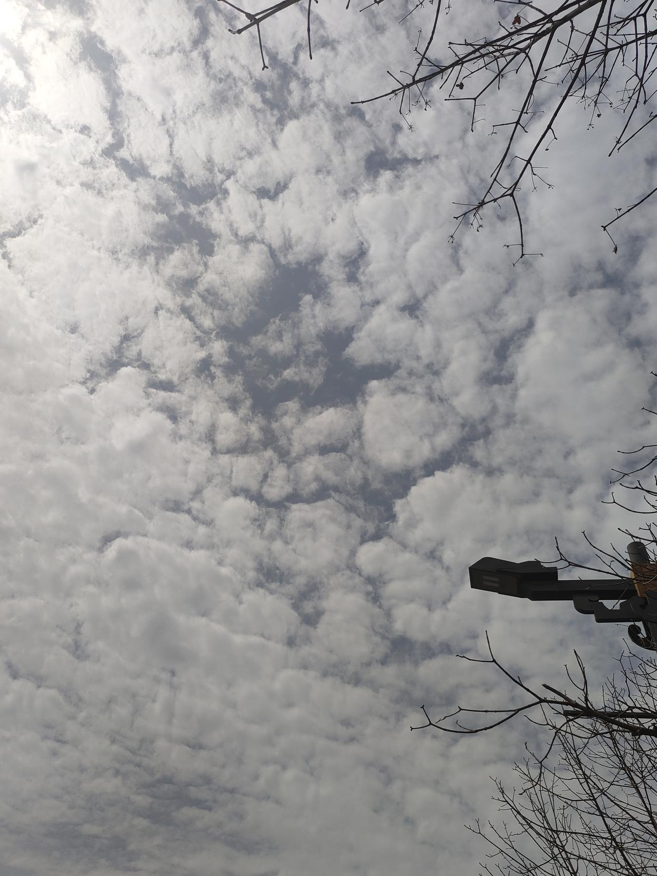 抬头是碎云漫过的天,枯枝在风里轻轻摇,把春日的温柔都揉进这一片清浅的蓝里。