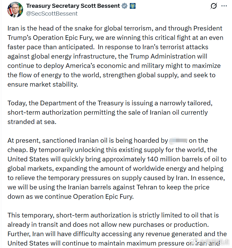 伊*是全球恐布主义的“毒蛇之首”,通过特朗普总统的 “史诗之怒行动”,我们在这场关键战役中取得了比预期更快的胜利。针对伊对全球能源基础设施的恐布袭击,特朗普政府将继续动用美国的经济和军事力量,以最大化全球能源供应、强化全球能源安全,并力求确保市场稳定。