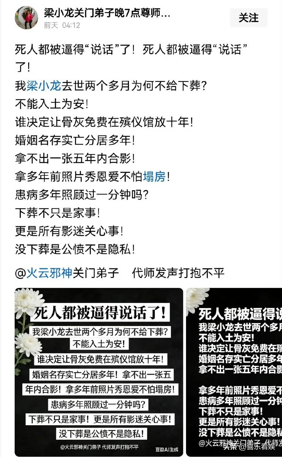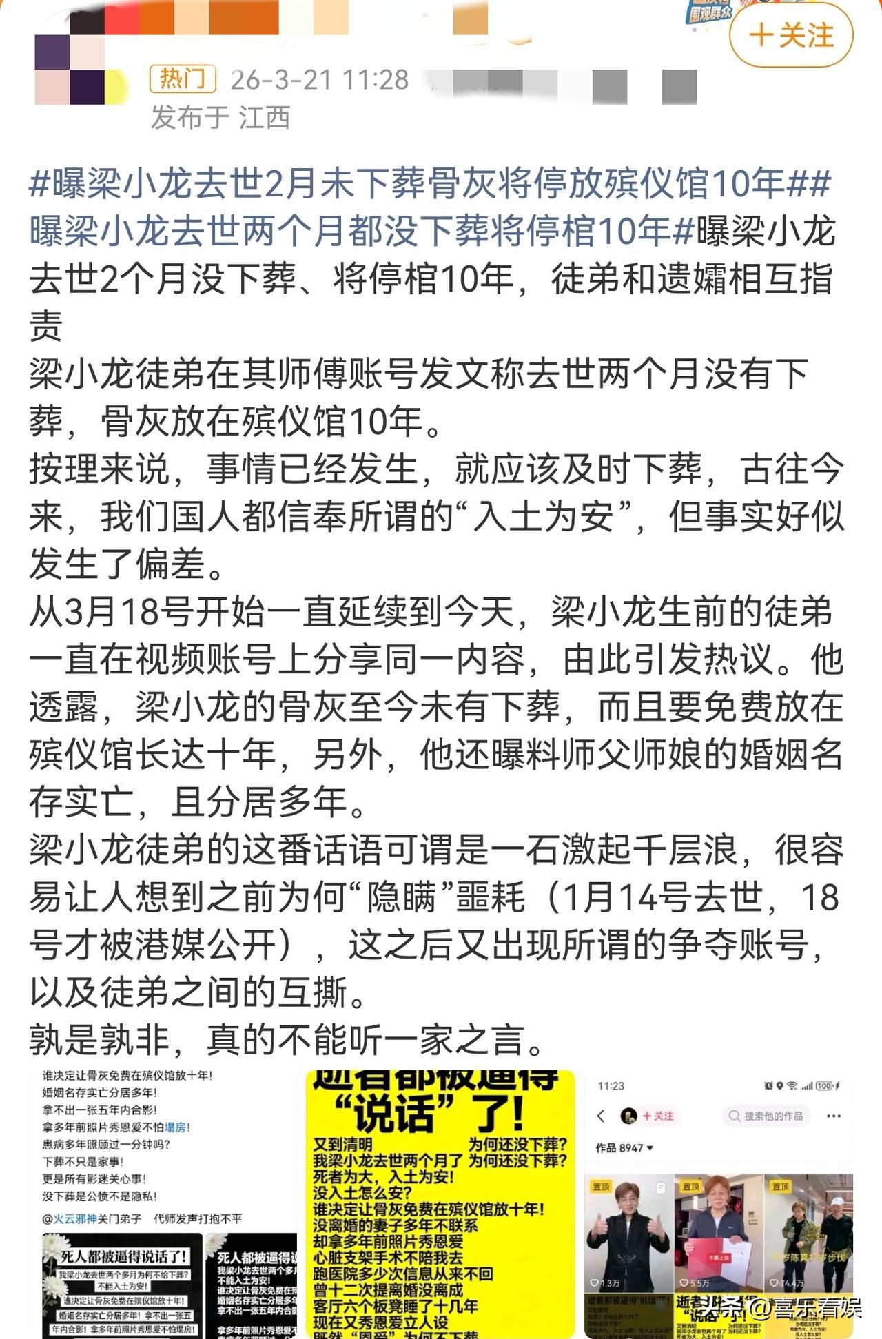 这是今天娱乐圈最让人意外的事! 3月21日,已经去世的了两个多月的梁小龙,突然冲上了热搜,原因看得人十分意外。 根据梁小龙徒弟在账号上爆料,师傅1月14号就走了,瞒到18号才被港媒捅出来。 这都过去两个多月了,梁小龙的骨灰居然还没下葬,还要在殡仪馆免费放十年。 更离谱的是,徒弟直接开撕梁小龙的遗孀,说两人婚姻早就名存实亡,分居好多年了。 连一张五年内的合影都拿不出来,还好意思拿老照片出来秀恩爱,脸都不要了。 徒弟还说,梁小龙患病这么多年,他的妻子根本没照顾过一分钟。 心脏支架手术、跑医院,全是徒弟们在忙前忙后,妻子连人影都见不到。 之前就闹过争夺账号、徒弟互撕的破事,现在连下葬都要扯皮。 好好一个前辈,走了都不能入土为安,还要被拿出来当流量工具,说实话还挺让人心寒的。 按咱们老理儿,死者为大,入土为安。 结果现在徒弟和梁小龙呢遗孀互相指责,把家事闹得全网皆知,全是利益在作祟。 谁对谁错咱不敢乱评,但看着好好一个武打前辈,身后事被搅成这样,说实话真的挺挺让人意外呢。 不管怎么说,希望梁小龙能早点入土为安吧。