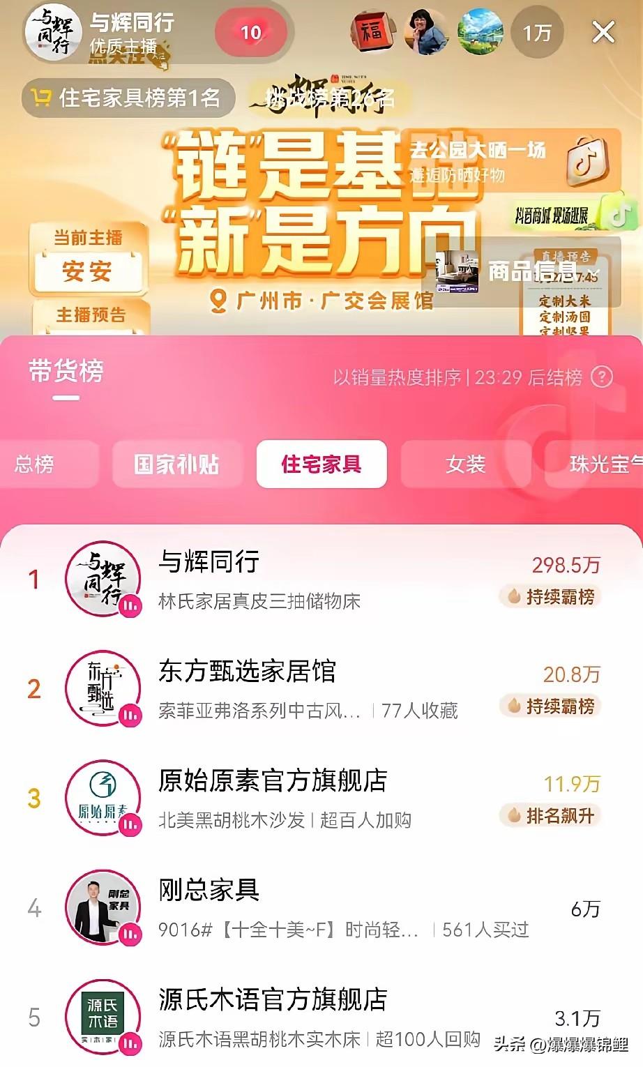 某些人真是双标得厉害。前两天看与辉同行排名靠后,那个阴阳怪气的劲儿,简直没眼看。 结果广州家博会的数据一贴出来,看到人家稳居榜首,这帮人的玻璃心立马就碎了一地。 当初拿排行榜踩别人的时候,怎么不说热度值不代表销售额了? 这会儿看人家遥遥领先,又开始抠字眼、找借口,承认别人优秀有那么难吗? 我觉得这就是典型的“只许州官放火,不许百姓点灯”。 嘴上叫得再响,没点真金白银的支持,排行榜能上去吗? 数据就在这摆着,亮眼得不行,不服气你也去消费啊,光靠“嘴嗨”可救不了直播间。 这下可好,宇辉这边的粉丝主打一个用实力说话。 事实证明,在这个圈子里,套路玩得再深,也抵不过实打实的真金白银!