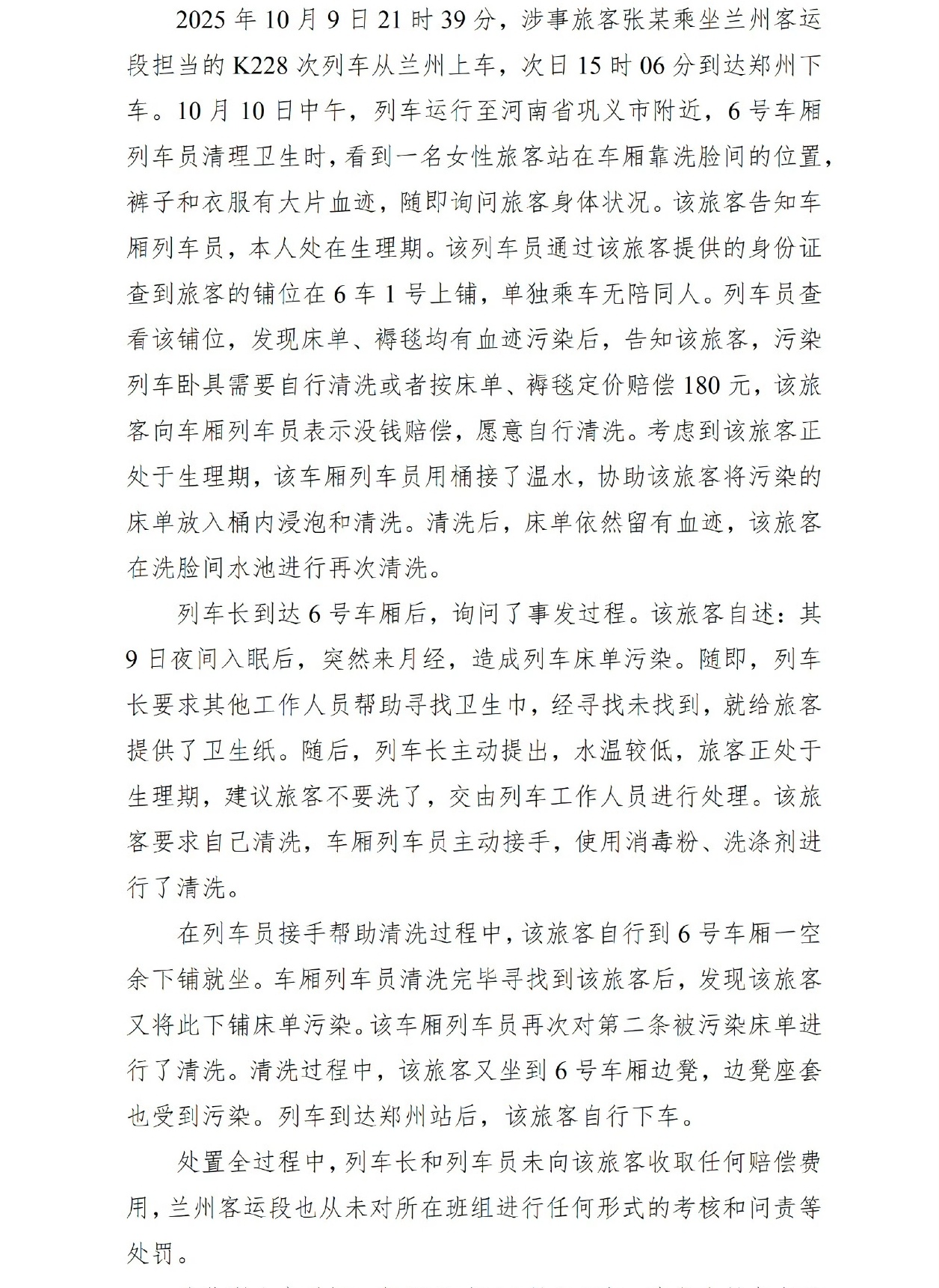 官方通报月经弄脏卧铺事件详情我看了下当事人的最新回应。真感觉挺无语的。官方在通报